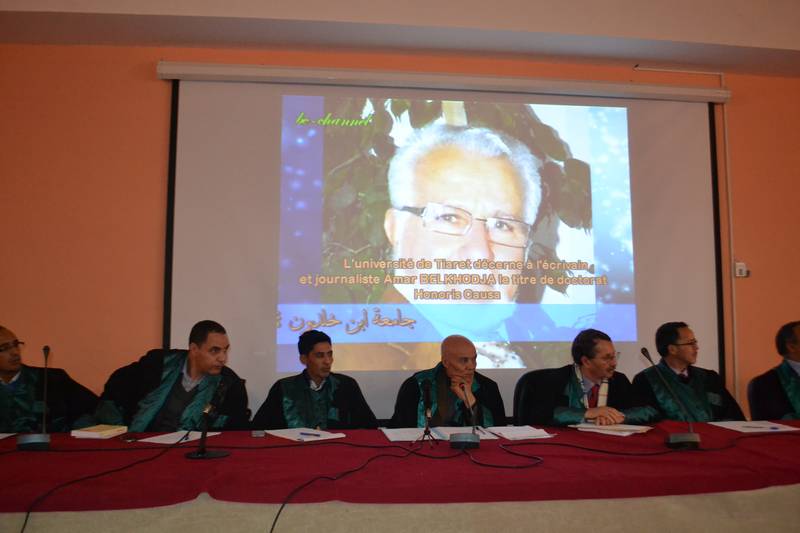 في مبادرة هي الأولى من نوعها بالنسبة لشخصية جزائرية، منحت جامعة ابن خلدون تيارت شهادة دكتوراه فخرية للكاتب والإعلامي الجزائري عمار بلخوجة، نظير اسهاماته العلمية والأدبية الفذة، حيث امتدت الفعالية على مدار يومين, اجتمع فيها الكاتب زوال يوم 19 / 02 / 2017 بلجنة المناقشة المكونة من كوكبة من الأساتذة على رأسهم أ.د طيب بن جامعة عميد كلية الآداب واللغات كرئيس لجنة و الذي استهل الجلسة بتلاوة رسالة التهنئة التي توجه بها أ.د طاهر حجار وزير التعليم العالي والبحث العلمي للكاتب وللجامعة على هاته المبادرة