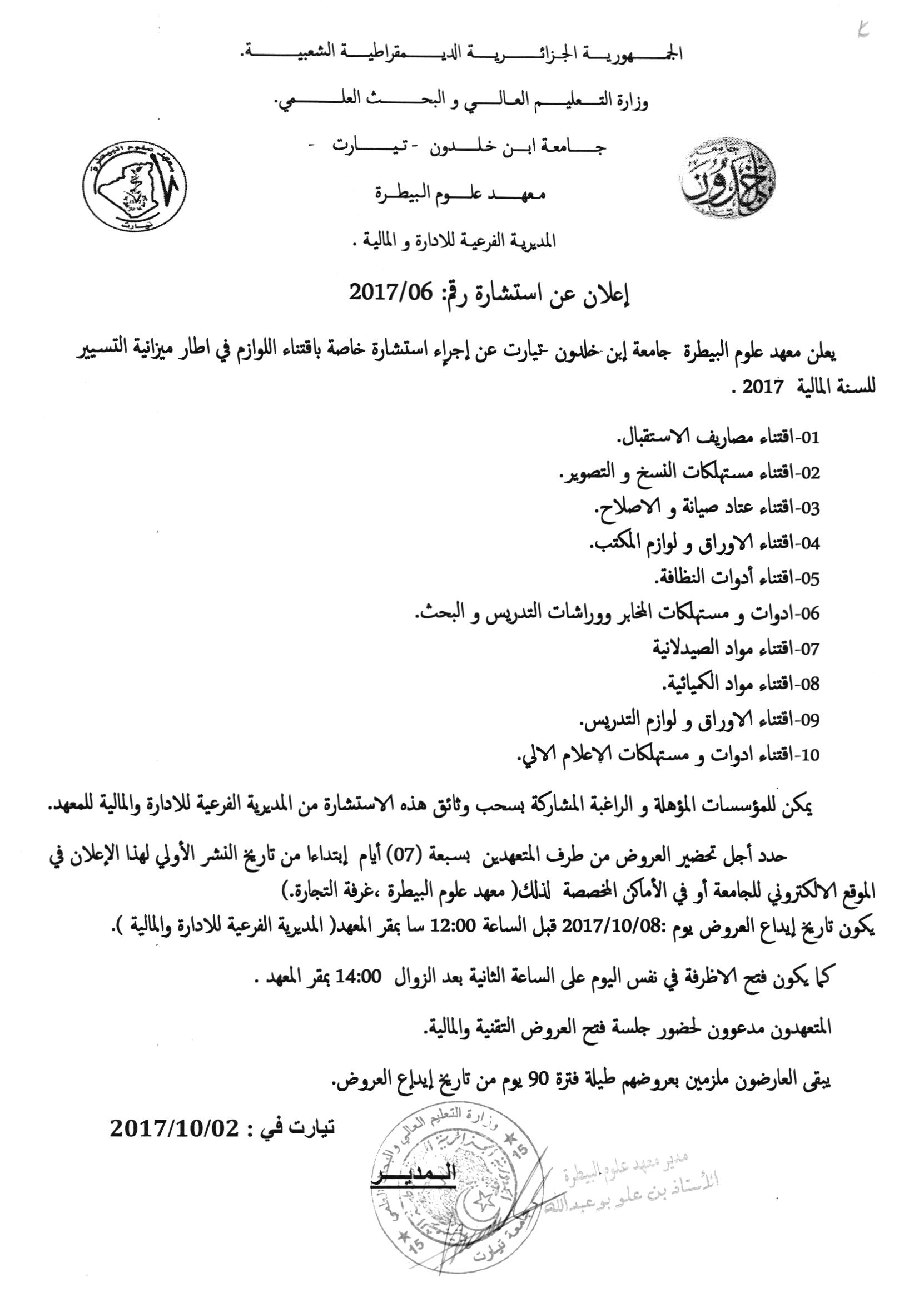 يعلن معهد علوم البيطرة عن اجراء استشارة خاصة باقتناء اللوازم في اطار ميزانية التسيير للسنة المالية 2017.