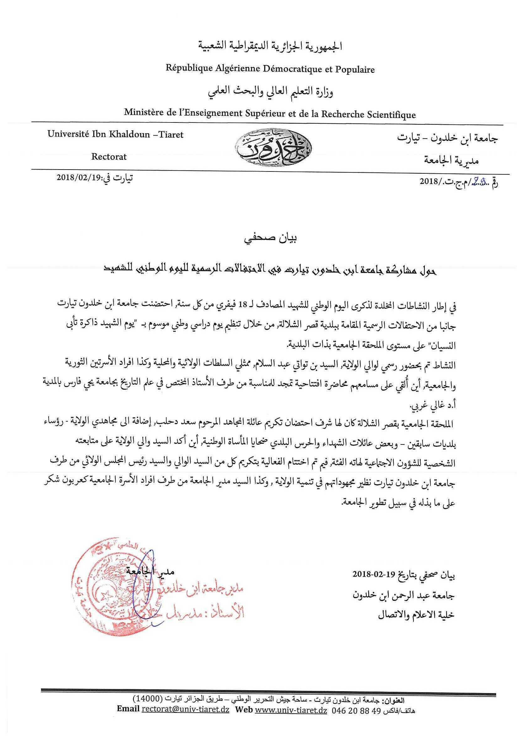 في إطار النشاطات المخلدة لذكرى اليوم الوطني للشهيد المصادف لـ 18 فيفري من كل سنة, احتضنت جامعة ابن خلدون تيارت جانبا من الاحتفالات الرسمية المقامة ببلدية قصر الشلالة, من خلال تنظيم يوم دراسي وطني موسوم بـ "يوم الشهيد ذاكرة تأبى النسيان" على مستوى الملحقة الجامعية بذات البلدية.