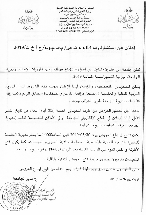نشر في 26-05-2019من طرف دامين سمير المصلحة كلية الآداب و اللغات تعلن جامعة ابن خلدون عن استشارة صيانة وملء قارورات الإطفاء بمديرية الجامعة
