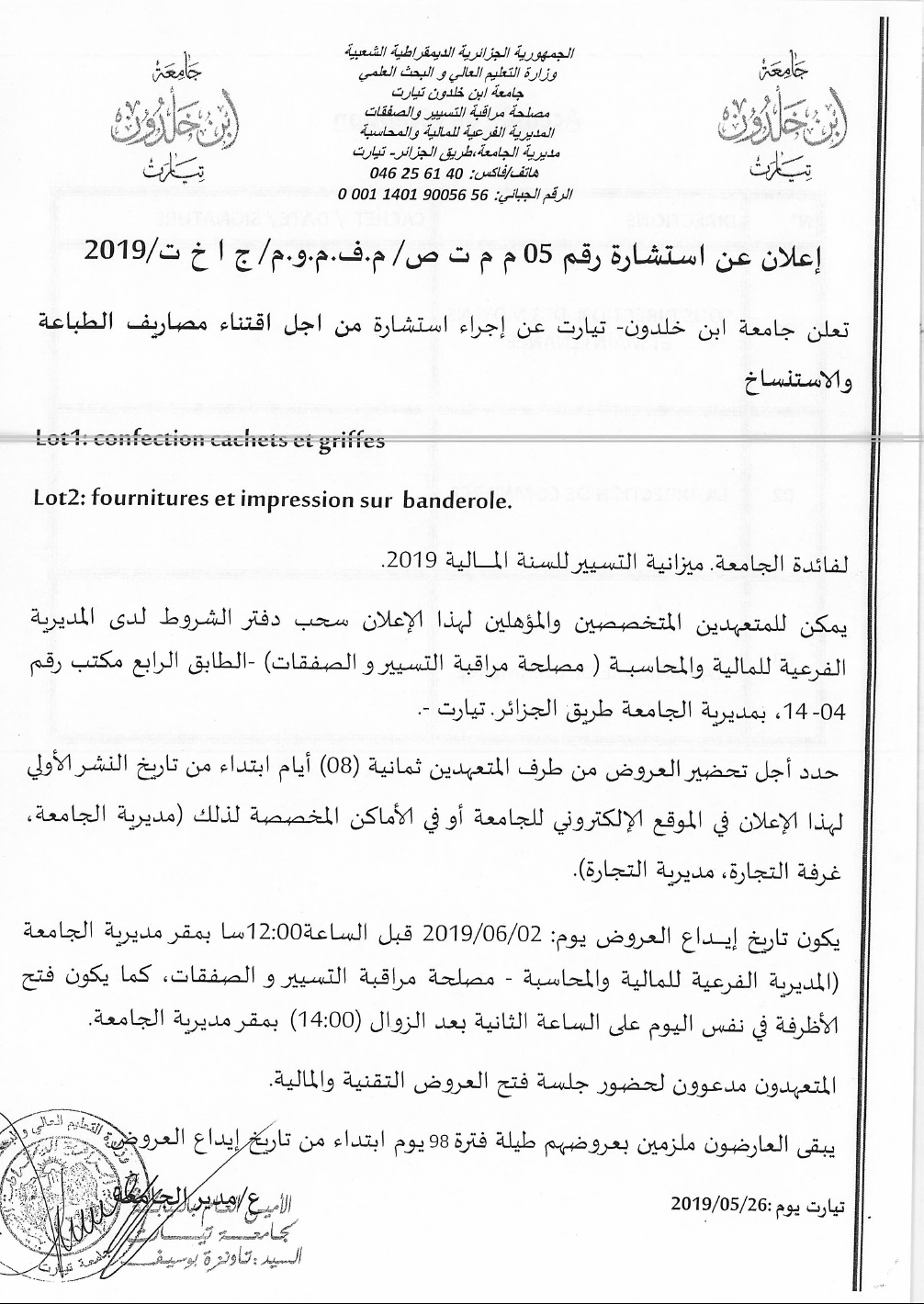 نشر في 26-05-2019من طرف دامين سمير المصلحة كلية الآداب و اللغات تعلن جامعة ابن خلدون تيارت عن إجراء استشارة من اجل اقتناء مصاريف الطباعة والاستنساخ لفائدة الجامعة
