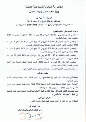 القرار رقم 259 يتمم القرار رقم 804 المؤرخ في 02 سبتمبر 2018 المحدد لرزنامة العطل الجامعية بعنوان السنة الجامعية 2018-2019 المعدلل والمتمم