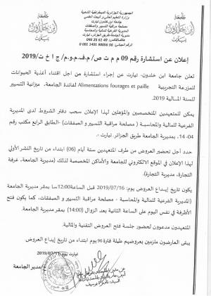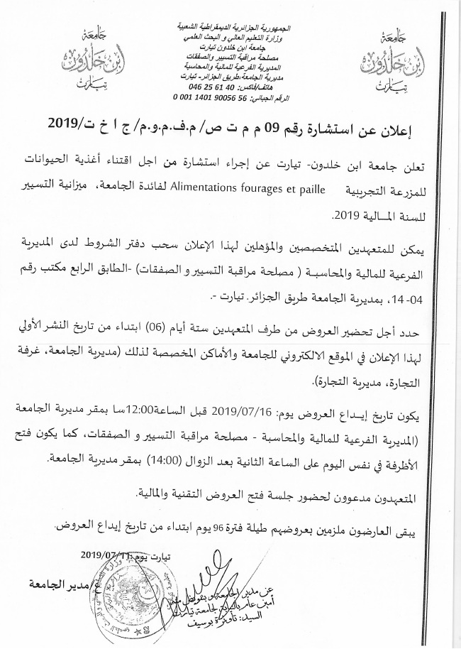 نشر في 11-07-2019من طرف دامين سمير المصلحة كلية الآداب و اللغات تعلن جامعة ابن خلدون تيارت عن اجراء استشارة من اجل اقتناء أغذية الحيوانات للمزرعة التجريبية لفائدة الجامعة للسنة المالية 2019
