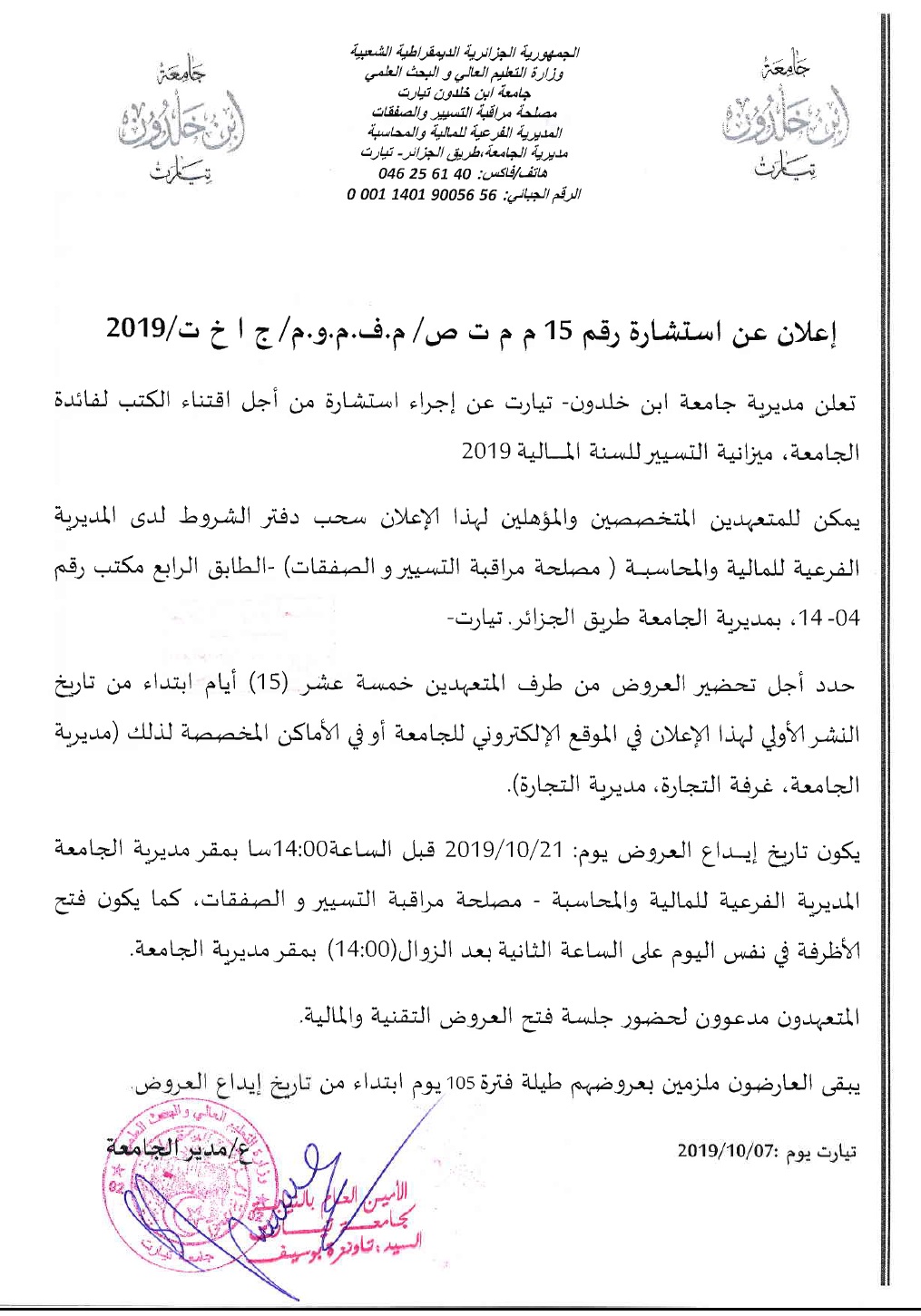 نشر في 07-10-2019من طرف دامين سمير المصلحة كلية الآداب و اللغات تعلن جامعة ابن خلدون تيارت عن اجراء استشارة من أجل اقتناء الكتب، لفائدة الجامعة ، ميزانية التسيير للسنة المالية 2019