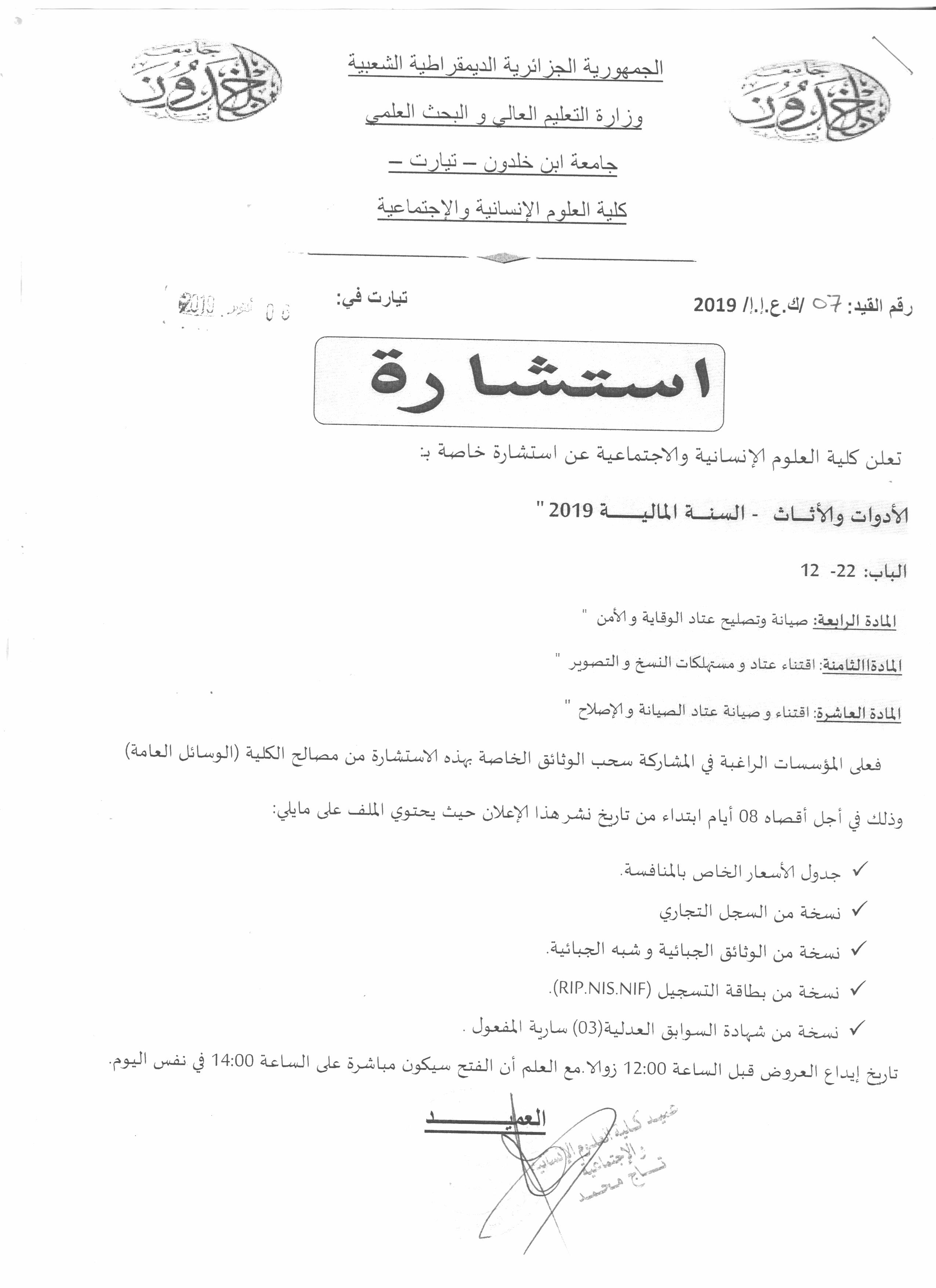 إستشارة رقم 07 الخاصة بصيانة و تصليح عتاد الوقاية و الأمن وإقتناء عتاد مستهلكات النسخ و التصوير و صيانة عتاد الصيانة و الإصلاح لكلية العلوم الإنسانية و الإجتماعية