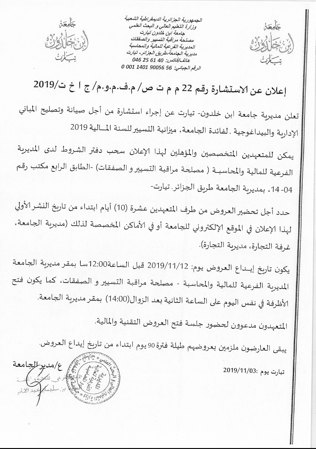 نشر في 03-11-2019من طرف دامين سمير المصلحة كلية الآداب و اللغات تعلن جامعة ابن خلدون بتيارت عن إعلان استشارة من أجل صيانة وتصليح المباني الإدارية والبيداغوجية لفائدة الجامعة ميزانية التسيير للسنة المالية 2019