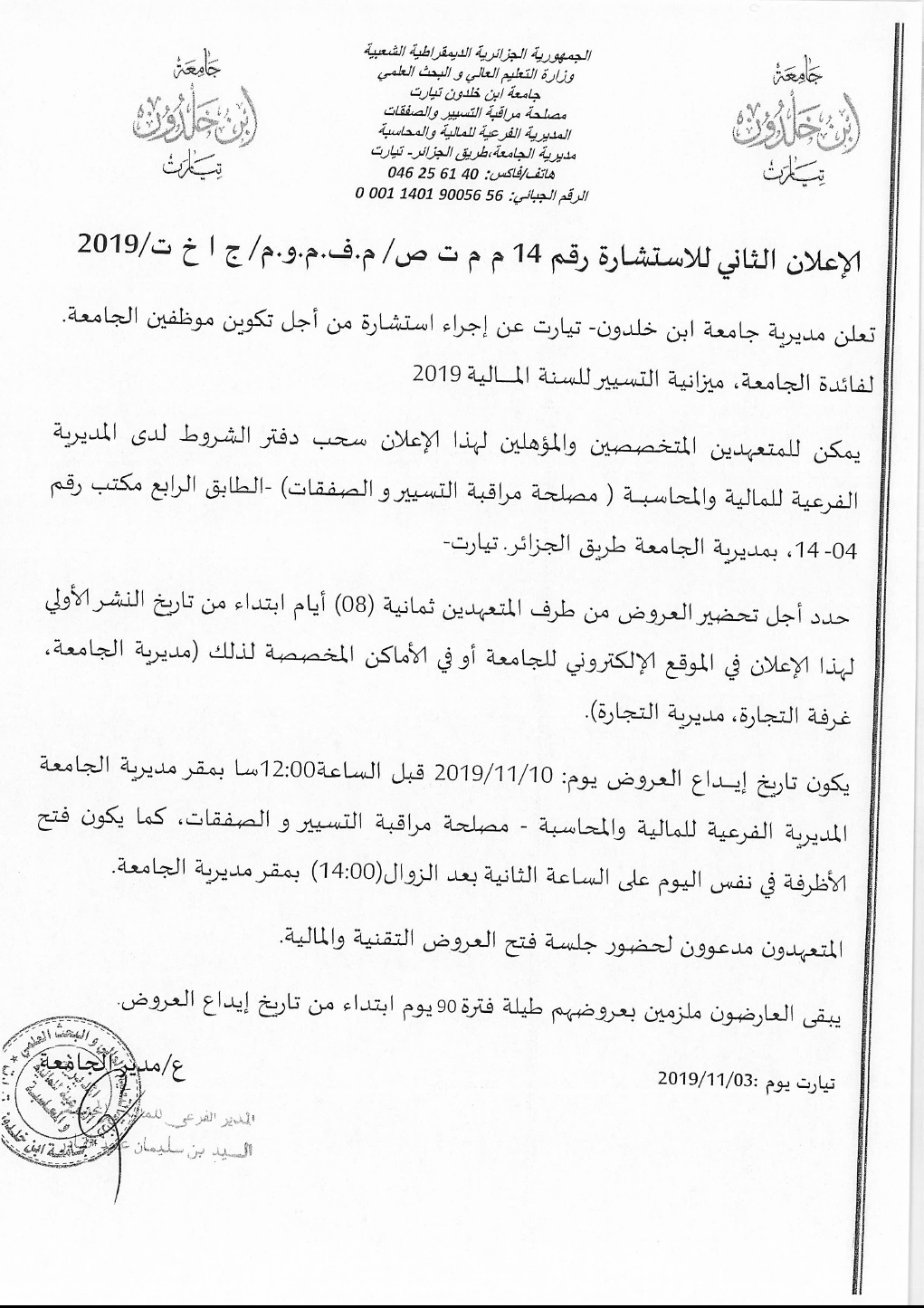 نشر في 03-11-2019من طرف دامين سمير المصلحة كلية الآداب و اللغات تعلن جامعة ابن خلدون بتيارت عن إعلان استشارة من أجل تكوين موظفي الجامعة ، لفائدة الجامعة ميزانية التسيير للسنة المالية 2019