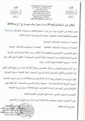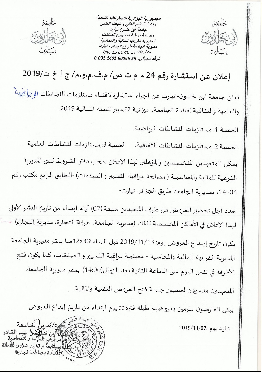 نشر في 07-11-2019من طرف دامين سمير المصلحة كلية الآداب و اللغات تعلن جامعة ابن خلدون بتيارت عن إعلان استشارة من لإقتناء مستلزمات النشاطات الريضية لفائدة الجامعة ميزانية التسيير للسنة المالية 2019