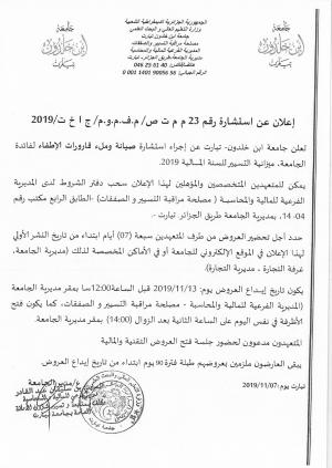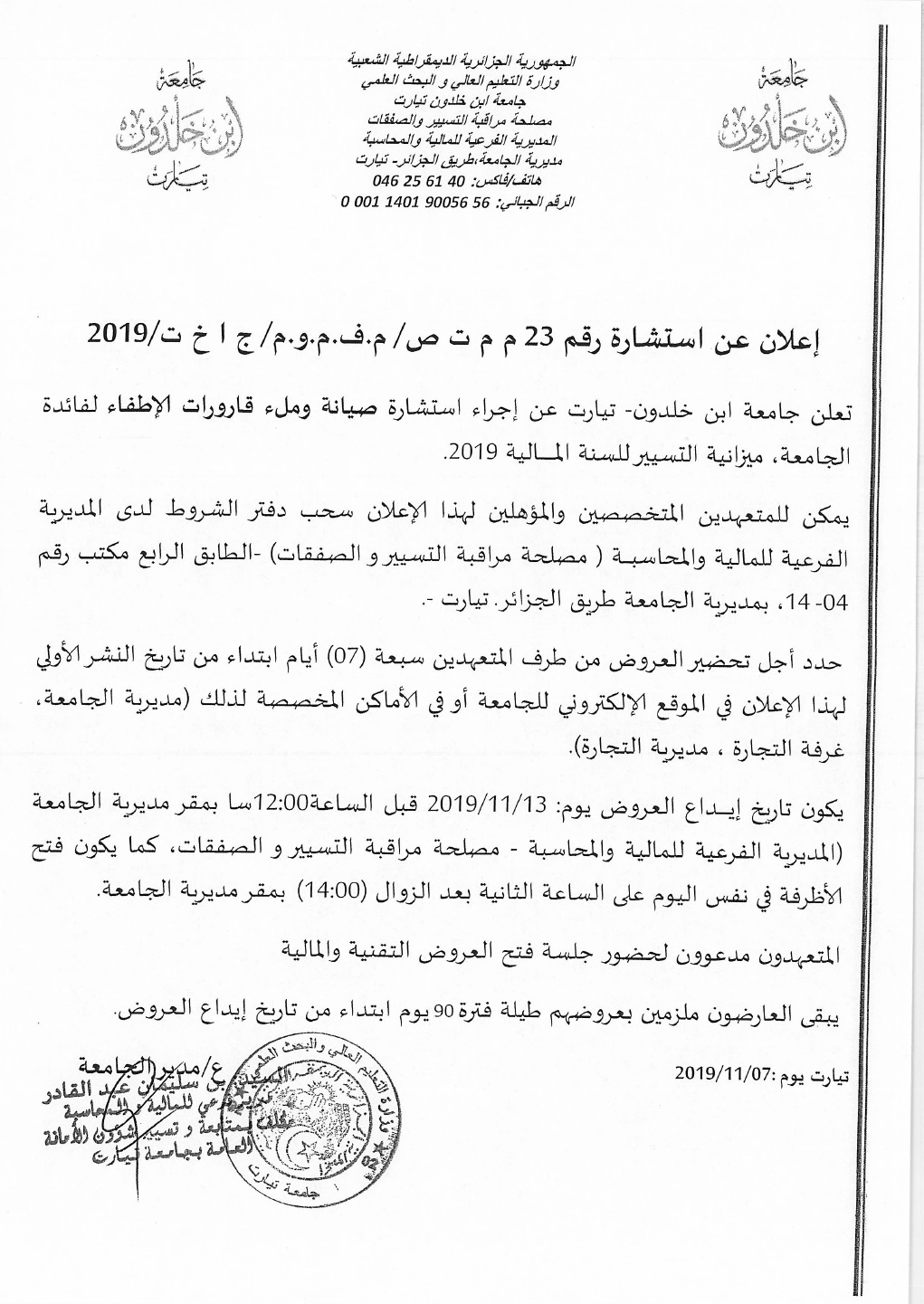 نشر في 07-11-2019من طرف دامين سمير المصلحة كلية الآداب و اللغات تعلن جامعة ابن خلدون بتيارت عن إعلان استشارة صيانة وملء قارورات الإطفاء لفائدة الجامعة ميزانية التسيير للسنة المالية 2019