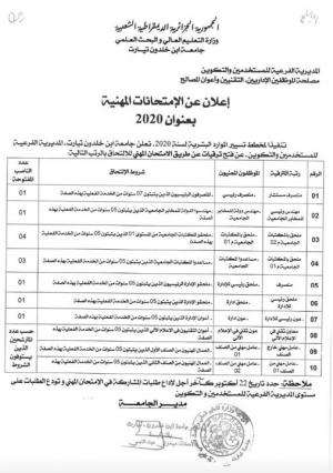 تنفيذا لمخطط تسيير الموارد البشرية لسنة 2020, تعلن المديرية الفرعية للمستخدمين والتكوين بجامعة ابن خلدون تيارت عن فتح الترقيات عن طريق الامتحان المهني للالتحاق بالرتب الموضحة في الجدول أدناه