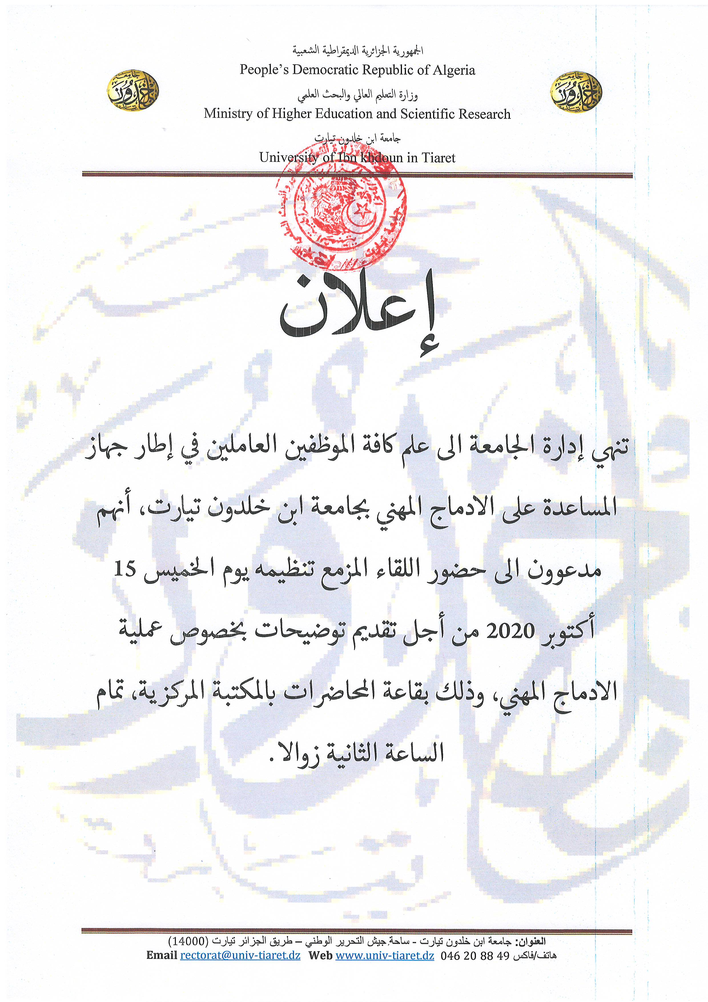 تنهي إدارة الجامعة الى علم كافة الموظفين العاملين في إطار جهاز المساعدة على الادماج المهني بجامعة ابن خلدون تيارت، أنهم مدعوون الى حضور اللقاء المزمع تنظيمه يوم الخميس 15 أكتوبر 2020