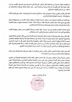بقلوب يعتصرها الحزن والاسى, تلقينا نبأ وفاة الاستاذ الفاضل بوخاتم ساعد, استاذ بكلية علوم الطبيعة والحياة ومسؤول المركز المكثف للغات