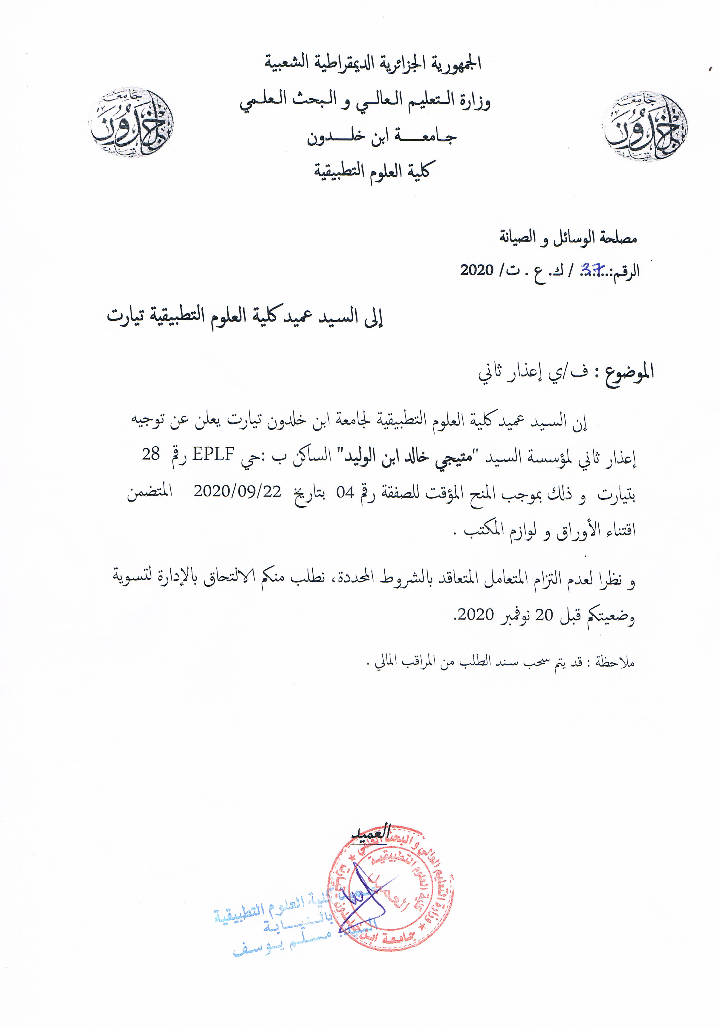 مديرية جامعة ابن خلدون تيارت مقابل ساحة جيش التحرير الوطني طريق الجزائر ص ب 78 تيارت الجزائر