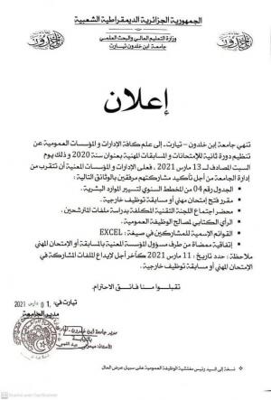 تنهي جامعة ابن خلدون تيارت, الى علم كافة الادارات والمؤسسات العمومية, عن تنظيم دورة ثانية للامتحانات والمسابقات المهنية بعنوان سنة 2020 , وذلك يوم السبت 13 مارس 2021 , وعليه فان ادارة الجامعة تدعوا الادارات والمؤسسات المهتمة والمعنية الى التقرب منها من أجل تأكيد مشاركتهم, مرفقين بالوثائق التالية