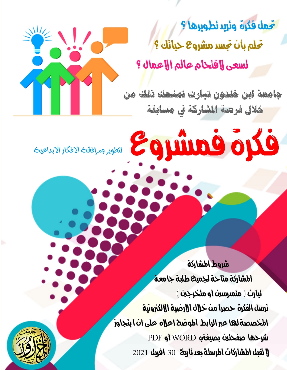 في إطار استراتيجيتها الرامية الى تطوير ومرافقة الافكار الابداعية, تطلق جامعة ابن خلدون مسابقة تنافسية موسومة بـ فكرة فمشروع وذلك لفائدة طلبة جامعة ابن خلدون تيارت خريجين كانوا او متمدرسين.
