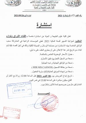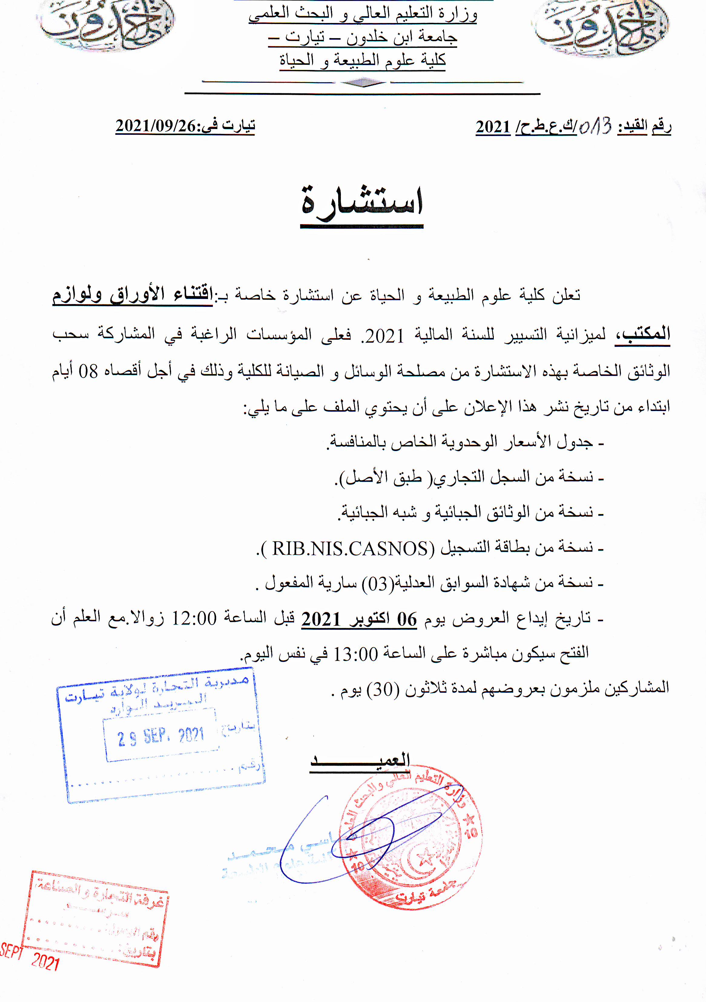 نشر في 30-09-2021من طرف حموسعيد كهينة المصلحة كلية علوم الطبيعة و الحياة تعلن كلية علوم الطبيعة و الحياة عن استشارة خاصة بـ: اقتناء الأوراق و لوازم المكتب، لميزانية التسيير للسنة المالية 2021
