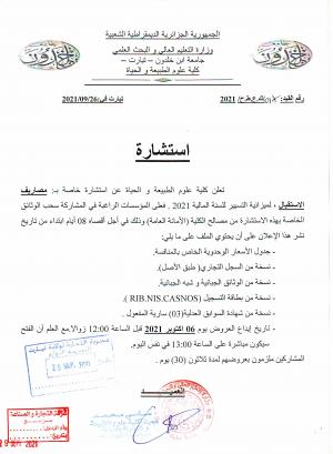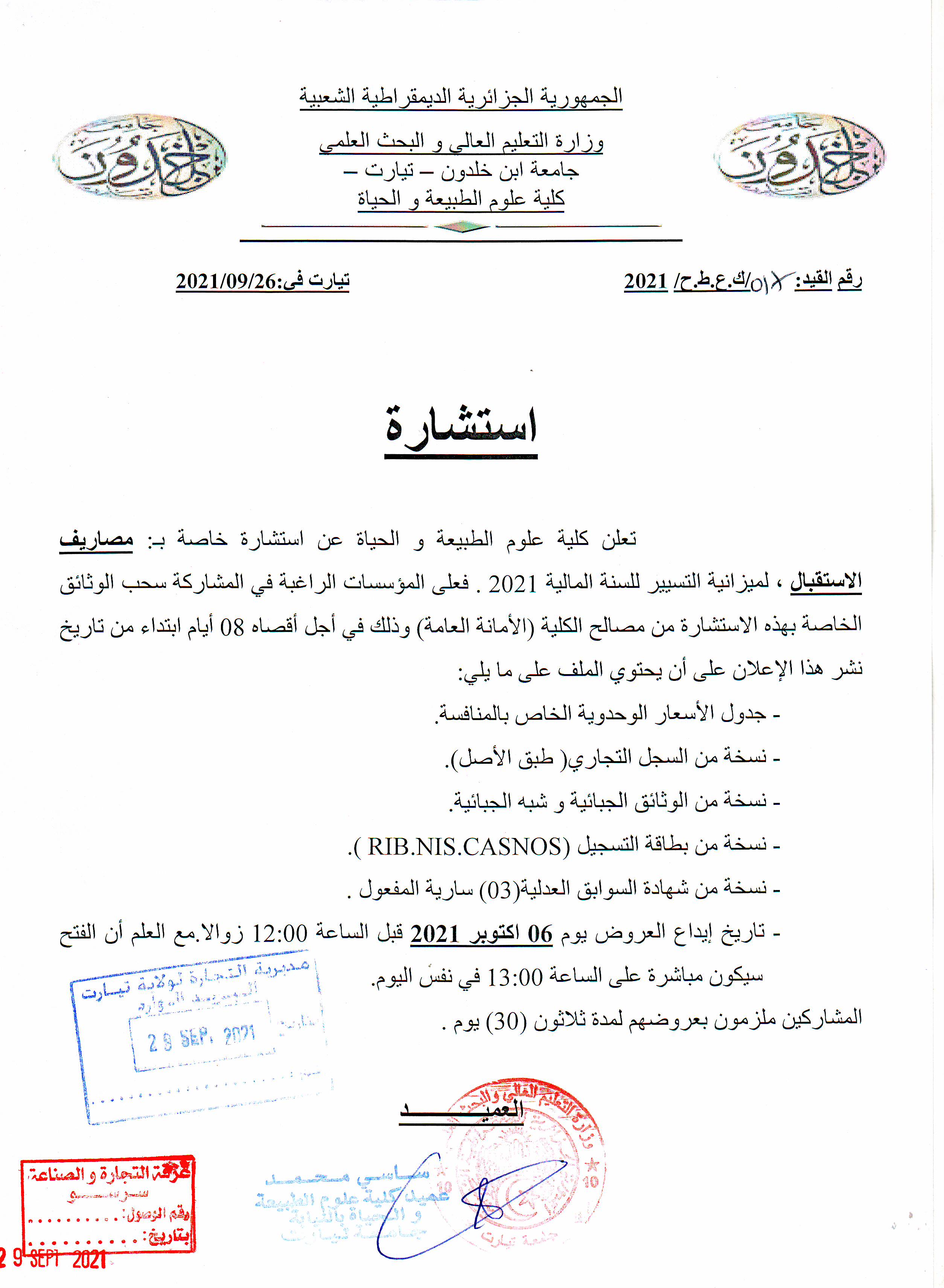 نشر في 30-09-2021من طرف حموسعيد كهينة المصلحة كلية علوم الطبيعة و الحياة تعلن كلية علوم الطبيعة و الحياة عن استشارة خاصة بـ: مصاريف الاستقبال، لميزانية التسيير للسنة المالية 2021