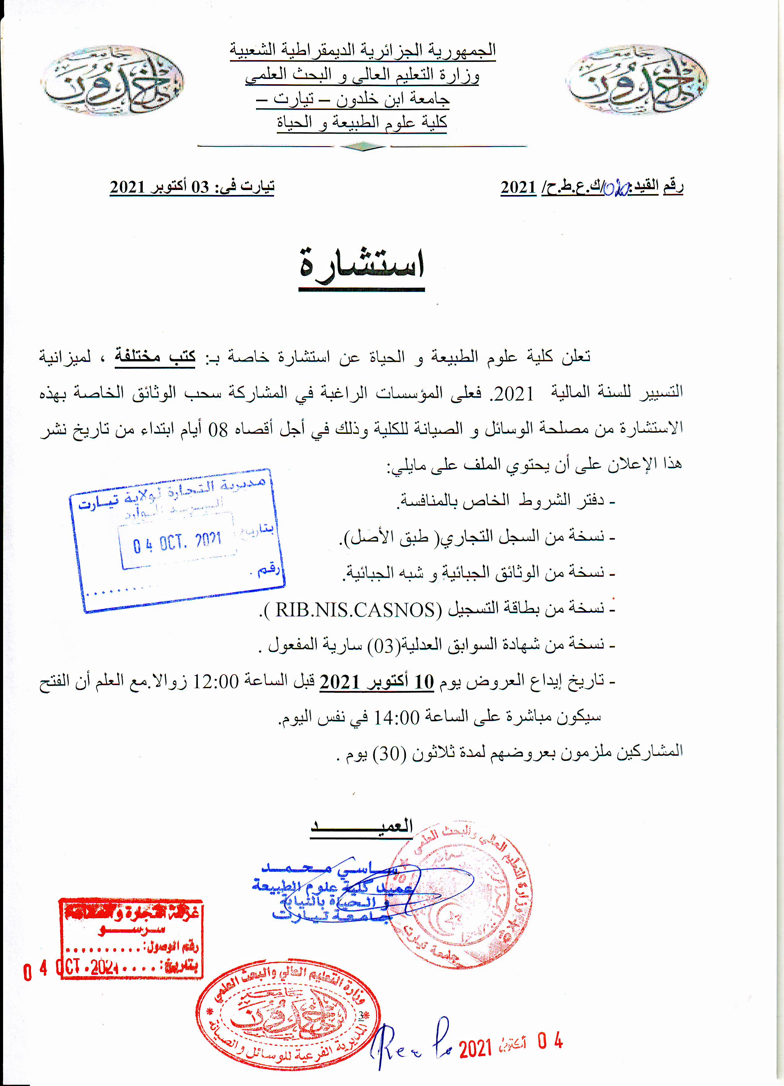 نشر في 05-10-2021من طرف حموسعيد كهينة المصلحة كلية علوم الطبيعة و الحياة تعلن كلية علوم الطبيعة و الحياة عن استشارة خاصة بـ: كتب مختلفة، لميزانية التسيير للسنة المالية 2021
