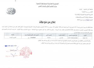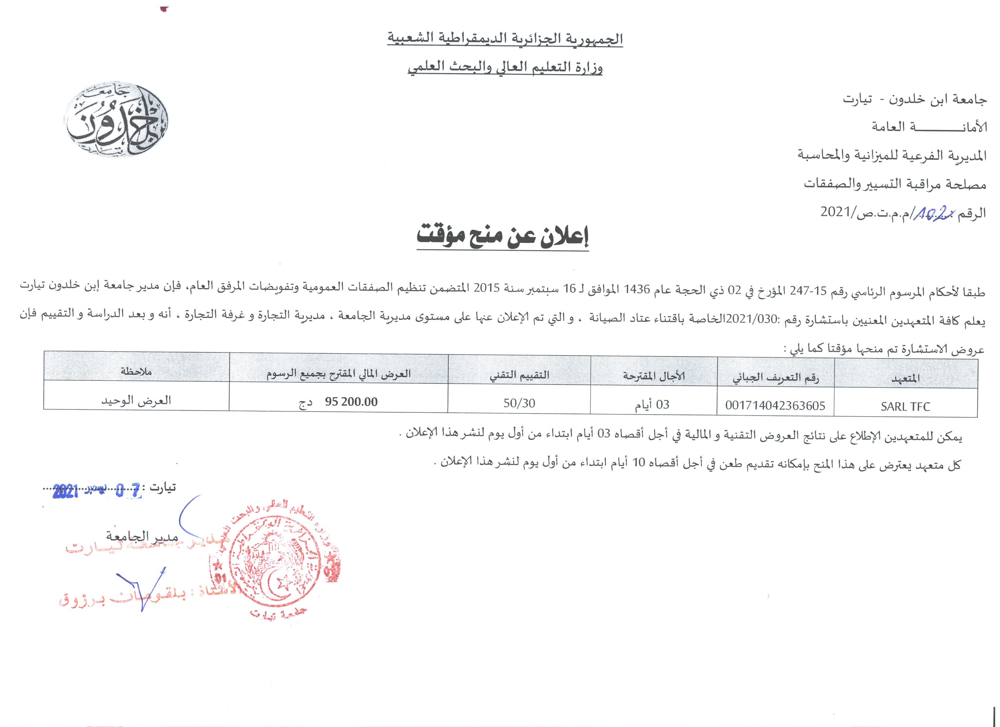 طبقا لأحكام المرسوم الرئاسي رقم 15-247 المؤرخ في 02 ذي الحجة عام 1436 الموافق لـ 16 سبتمبر سنة 2015 المتضمن تنظيم الصفقات العمومية وتفويضات المرفق العام، فإن مدير جامعة إبن خلدون تيارت يعلم كافة المتعهدين المعنيين باستشارة رقم : 030/2021الخاصة باقتناء عتاد الصيانة ، أنه و بعد الدراسة و التقييم فإن عروض الاستشارة تم منحها كما هو موضح في الملف المرفق