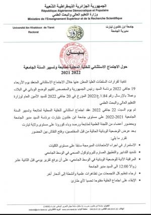 تم يوم السبت 22 جانفي 2022 عقد اجتماع استثنائي للخلية المحلية لمتابعة وتسيير السنة الجامعية 2021/2022 , على مستوى جامعة ابن خلدون تيارت برئاسة السيد مدير الجامعة