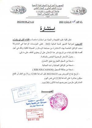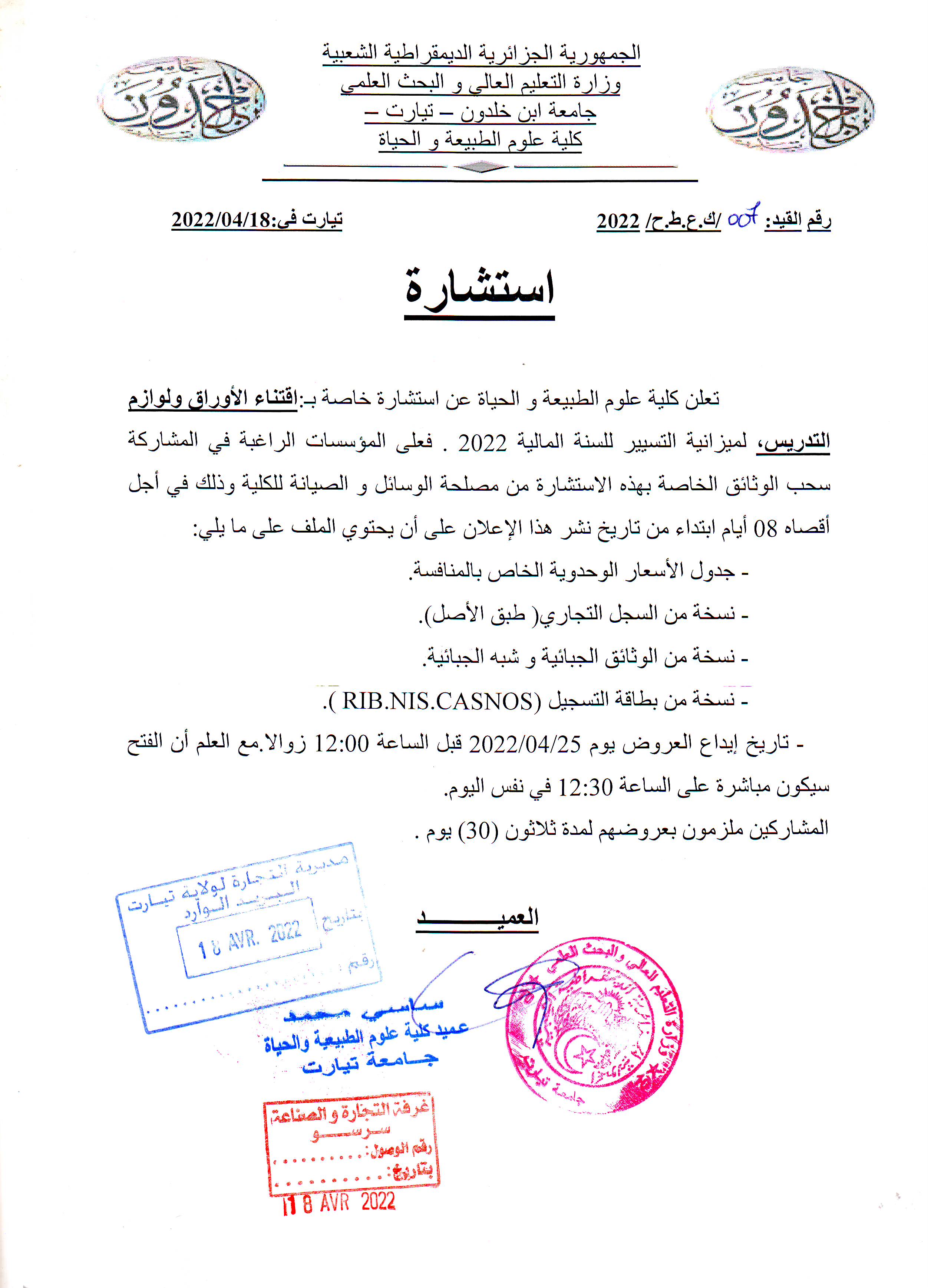 نشر في 18-04-2022من طرف حموسعيد كهينة المصلحة كلية علوم الطبيعة و الحياة تعلن كلية علوم الطبيعة و الحياة عن استشارة خاصة بـ: اقتناء الأوراق و لوازم التدريس، لميزانية التسيير للسنة المالية 2022