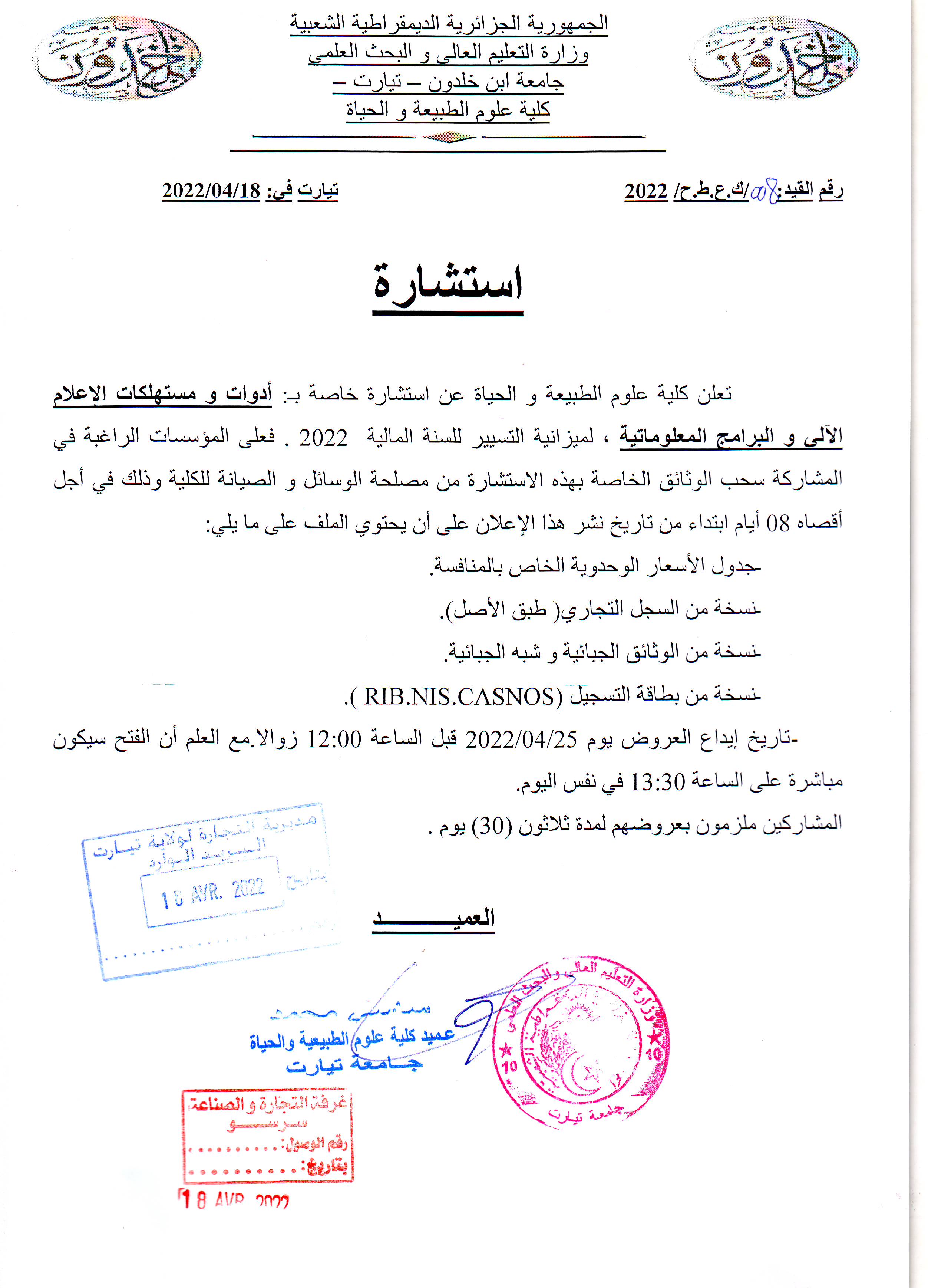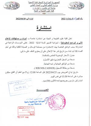 نشر في 18-04-2022 من طرف حموسعيد كهينة المصلحةكلية علوم الطبيعة و الحياة تعلن كلية علوم الطبيعة و الحياة عن استشارة خاصة بـ: أدوات و مستهلكات الاعلام الآلي و البرامج المعلوماتية، لميزانية التسيير للسنة المالية 2022