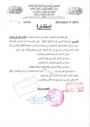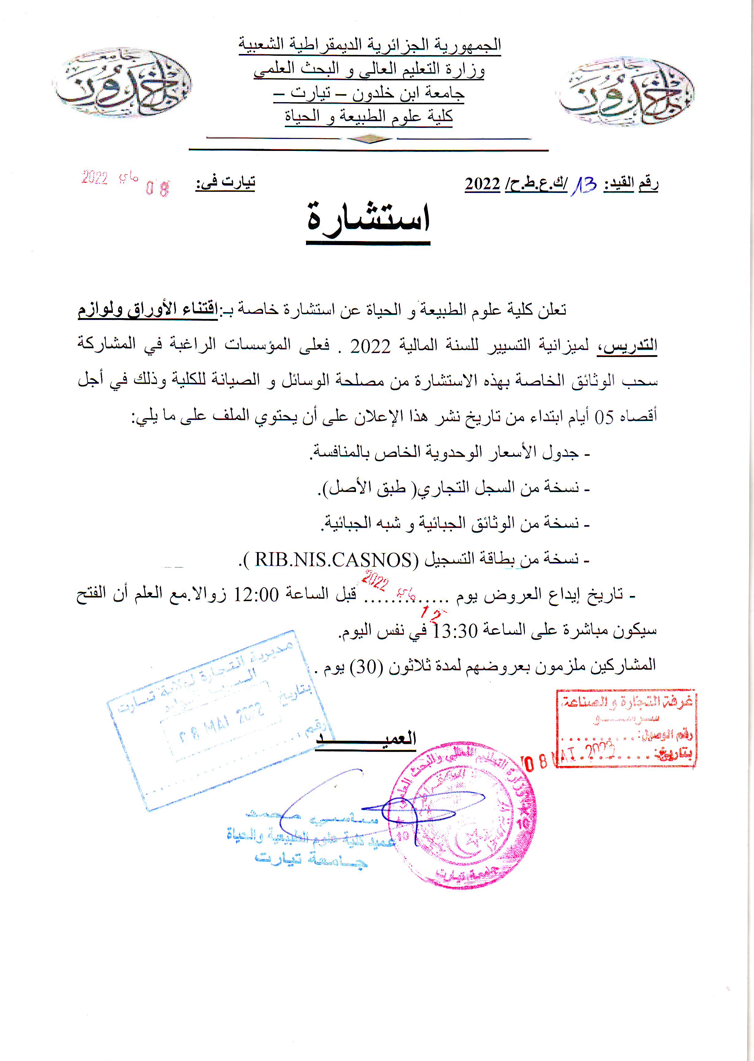 نشر في 08-05-2022من طرف حموسعيد كهينة المصلحة كلية علوم الطبيعة و الحياة تعلن كلية علوم الطبيعة و الحياة عن استشارة خاصة بـ: اقتناء الأوراق و لوازم التدريس، لميزانية التسيير للسنة المالية 2022