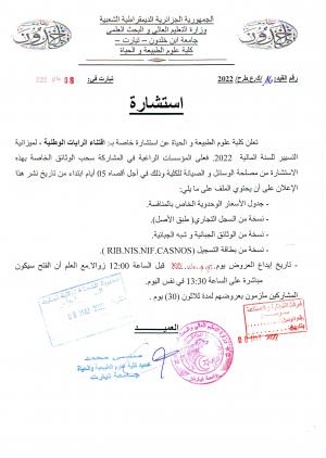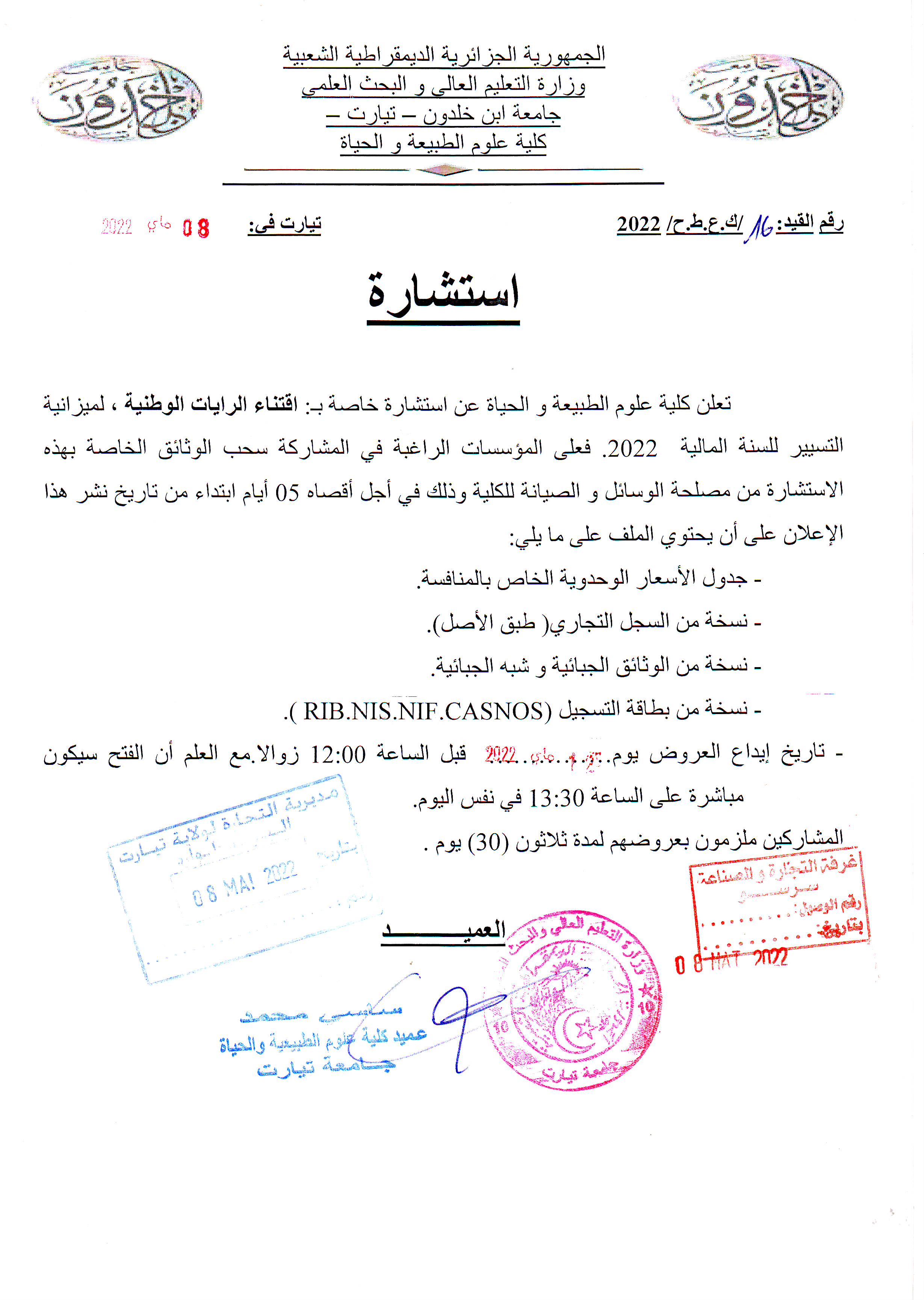 نشر في 08-05-2022من طرف حموسعيد كهينة المصلحة كلية علوم الطبيعة و الحياة تعلن كلية علوم الطبيعة و الحياة عن استشارة خاصة بـ: اقتناء الرايات الوطنية، لميزانية التسيير للسنة المالية 2022