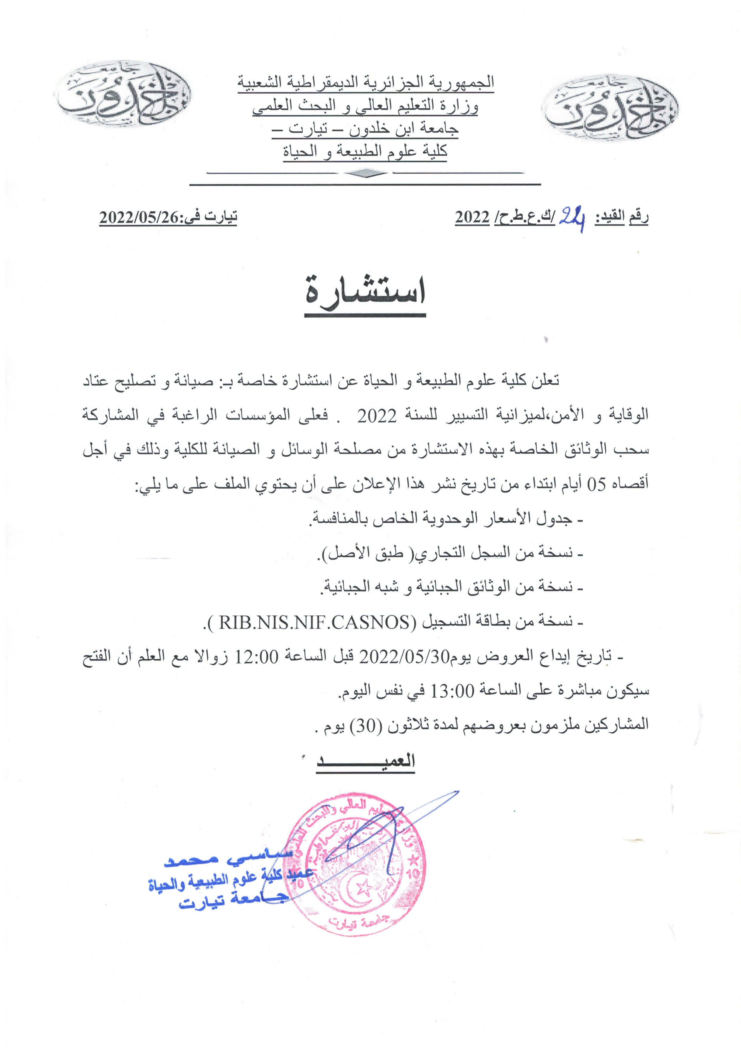 نشر في 26-05-2022من طرف حموسعيد كهينة المصلحة كلية علوم الطبيعة و الحياة تعلن كلية علوم الطبيعة و الحياة عن استشارة خاصة بـ:صيانة و تصليح عتاد الوقاية و الأمن، لميزانية التسيير للسنة المالية 2022