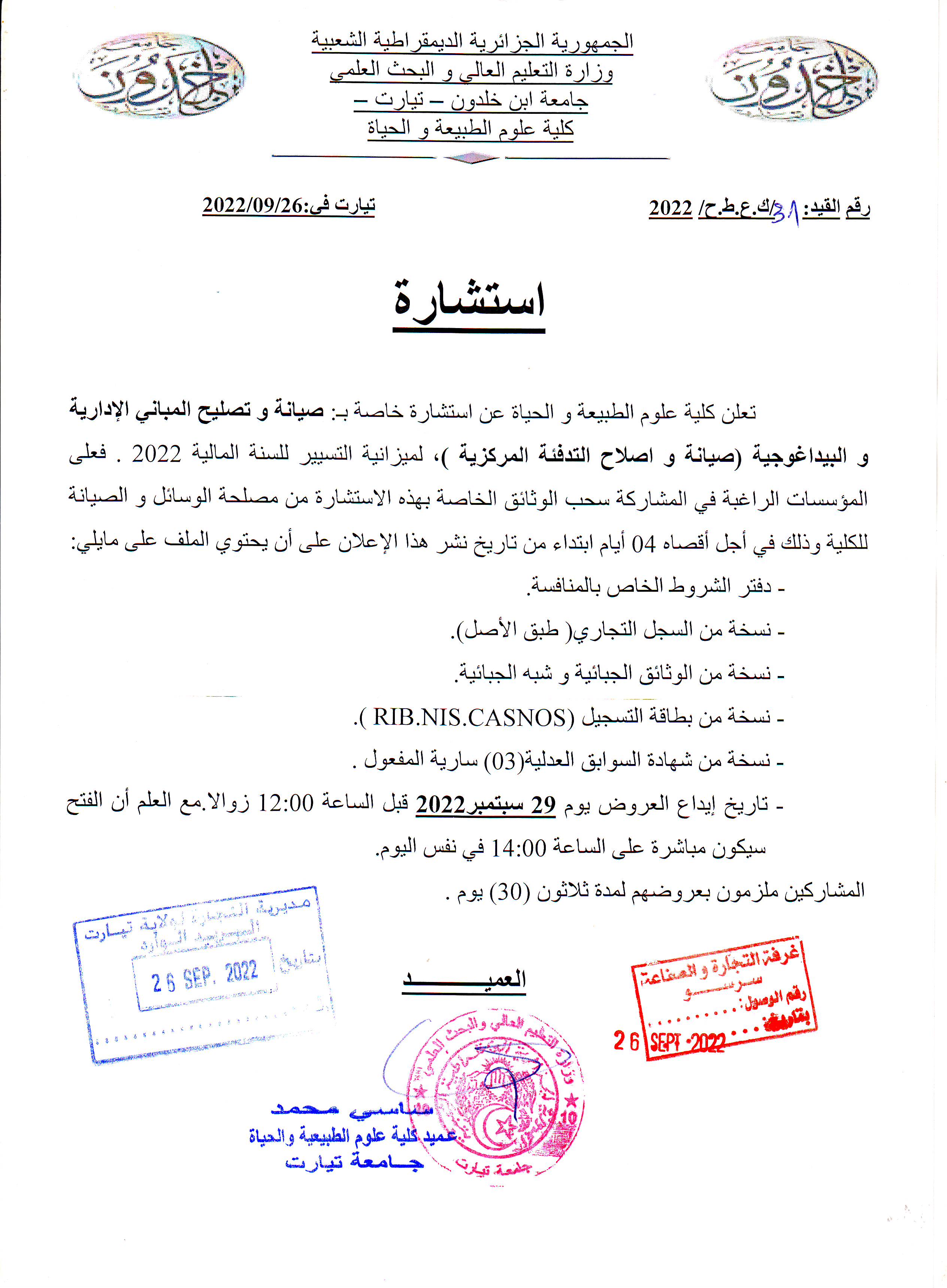 تعلن كلية علوم الطبيعة و الحياة عن استشارة خاصة بــ: صيانة و تصليح المباني الادارية و البيداغوجية (صيانة و إصلاح التدفئة المركزية) لميزانية التسيير للسنة المالية 2022