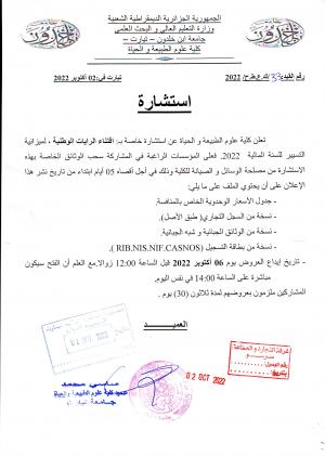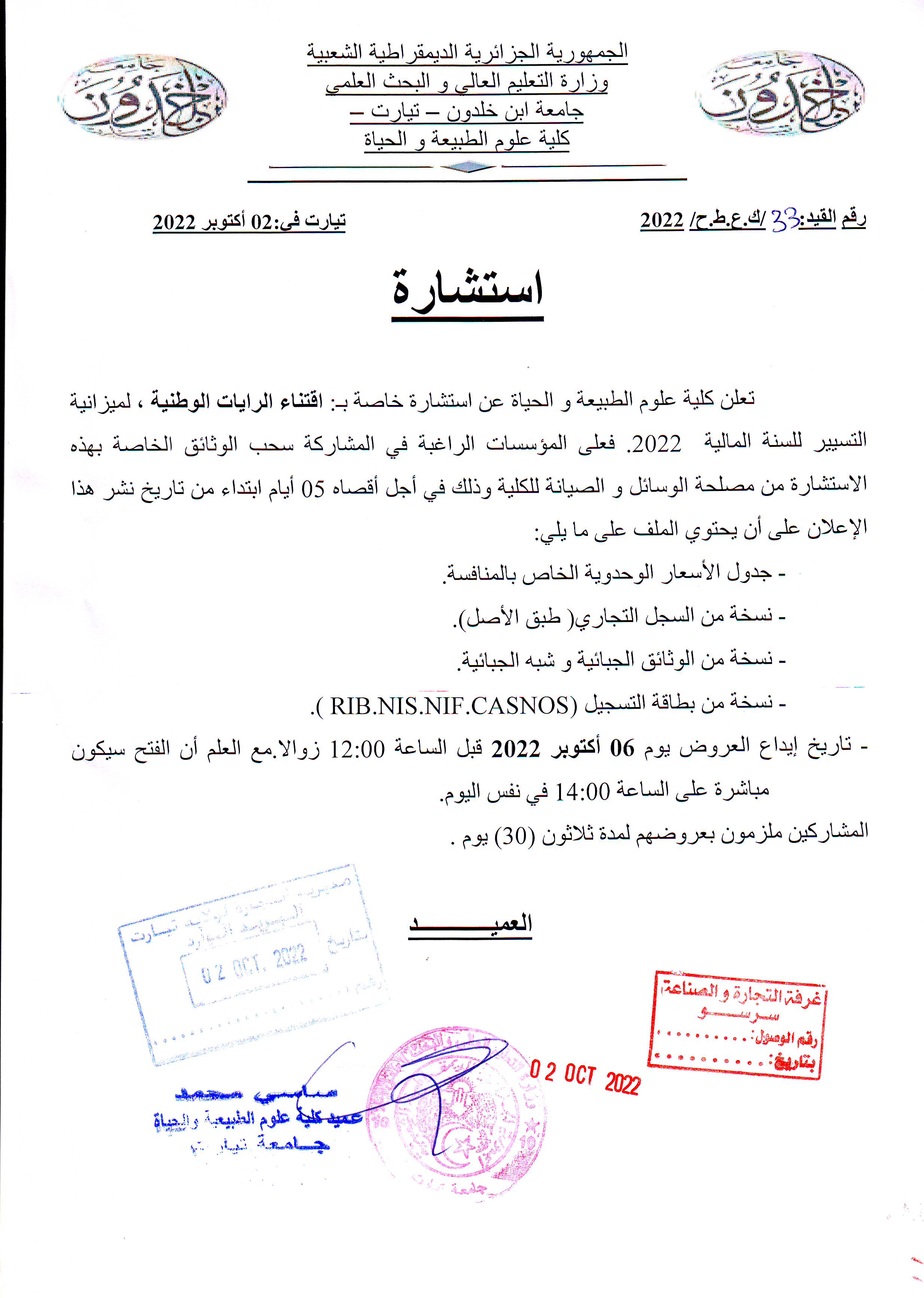نشر في 02-10-2022من طرف حموسعيد كهينة المصلحة كلية علوم الطبيعة و الحياة تعلن كلية علوم الطبيعة و الحياة عن استشارة خاصة بــ:اقتناء الرايات الوطنية لميزانية التسيير للسنة المالية 2022