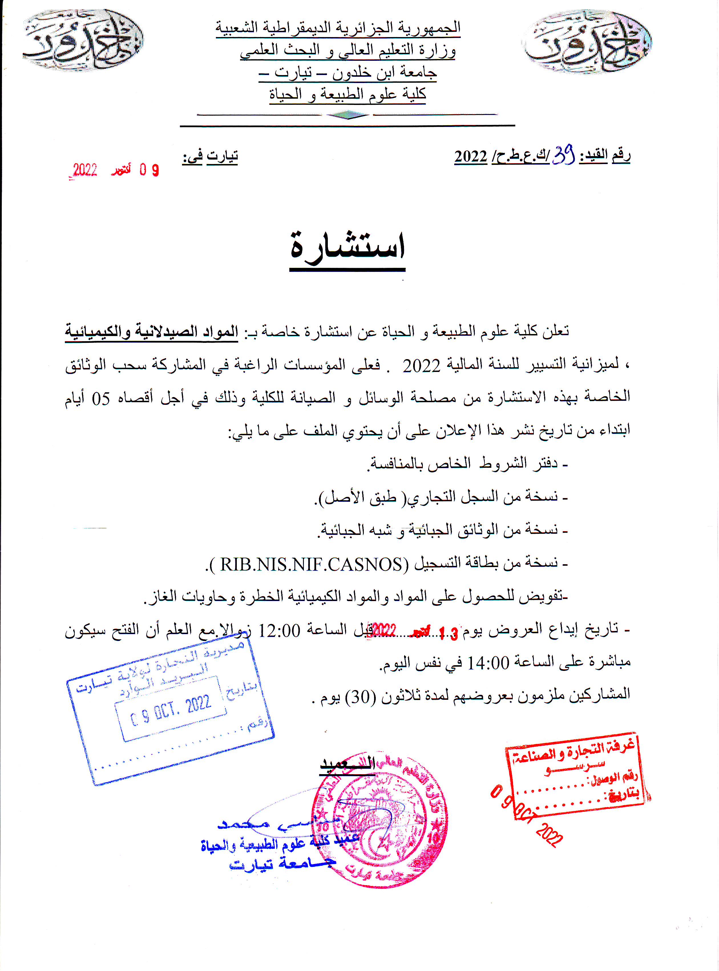 نشر في 09-10-2022من طرف حموسعيد كهينة المصلحة كلية علوم الطبيعة و الحياة تعلن كلية علوم الطبيعة و الحياة عن استشارة خاصة بــ: المواد الصيدلانية و الكيميائية لميزانية التسيير للسنة المالية 2022