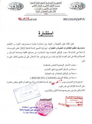 نشر في 09-10-2022 من طرف حموسعيد كهينة المصلحةكلية علوم الطبيعة و الحياة تعلن كلية علوم الطبيعة و الحياة عن استشارة خاصة بــ: مصاريف الايواء و الاطعام (مصاريف تنظيم التظاهرات العلمية و التقنية) التسيير للسنة المالية 2022