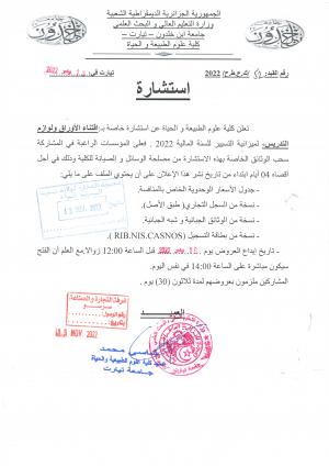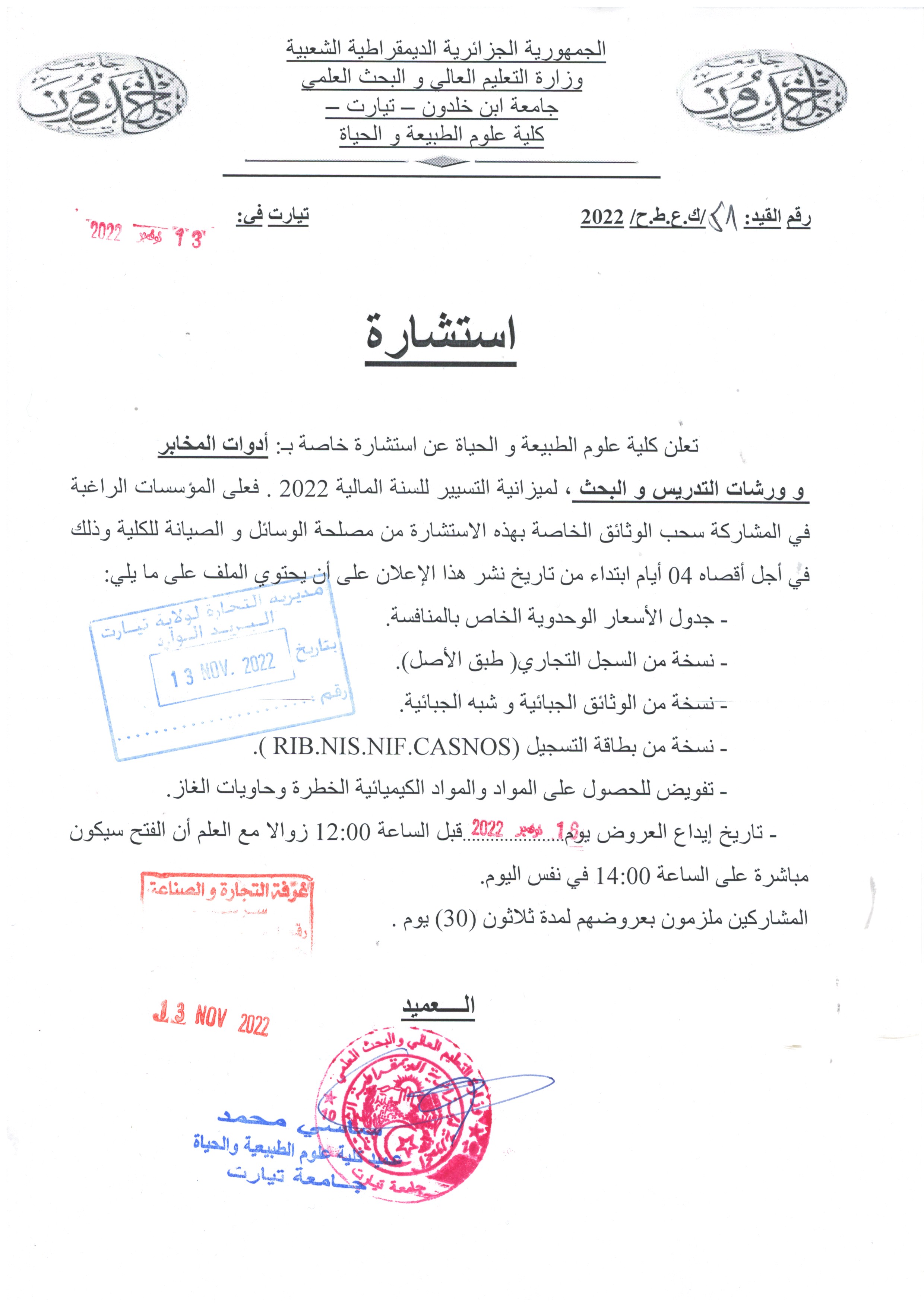 نشر في 14-11-2022من طرف حموسعيد كهينة المصلحة كلية علوم الطبيعة و الحياة تعلن كلية علوم الطبيعة و الحياة عن استشارة خاصة بــ: اقتناء الأوراق و لوازم التدريس لميزانية التسيير للسنة المالية 2022