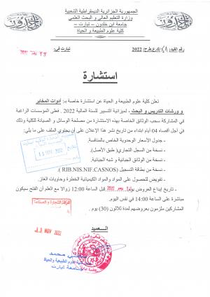 نشر في 14-11-2022 من طرف حموسعيد كهينة المصلحةكلية علوم الطبيعة و الحياة تعلن كلية علوم الطبيعة و الحياة عن استشارة خاصة بــ: أدوات المخابر و ورشات التدريس و البحث لميزانية التسيير للسنة المالية 2022