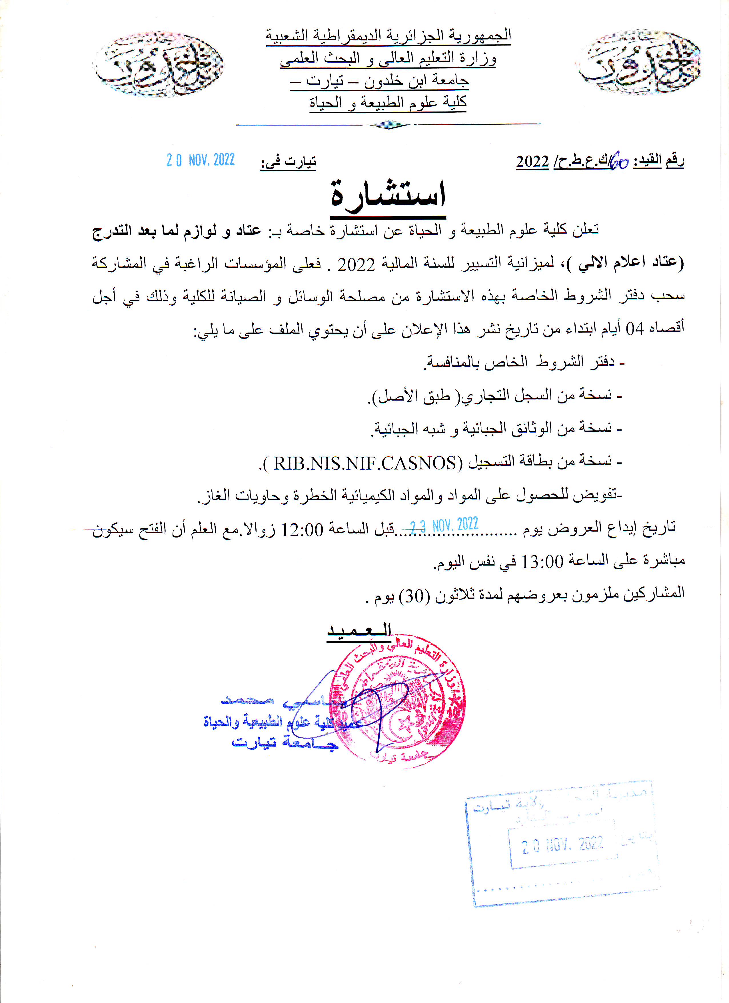 نشر في 20-11-2022 من طرف حموسعيد كهينة المصلحةكلية علوم الطبيعة و الحياة تعلن كلية علوم الطبيعة و الحياة عن استشارة خاصة بــ: عتاد و لوازم لما بعد التدرج (عتاد الاعلام الآلي) لميزانية التسيير للسنة المالية 2022