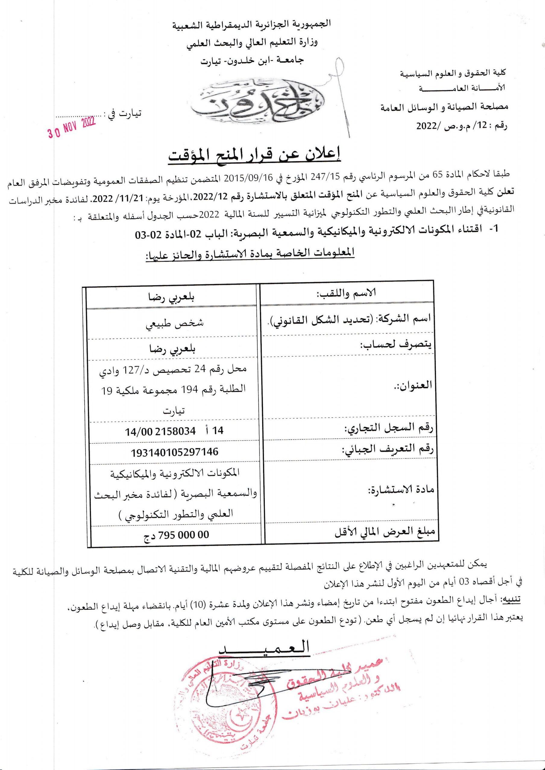 طبقا لأحكام المادة 65 من المرسوم الرئاسي رقم 15/247 المؤرخ في 16/09/2015 المتضمن تنظيم الصفقات العمومية وتفويضات المرفق العام تعلن كلية الحقوق والعلوم السياسية عن قرار المنح المؤقت المتعلق بالإستشارة رقم 12/2022 المؤرخة في 21/11/2022 لفائدة مخبر الدراسات القانونية لميزانية التسيير للسنة المالية 2022 حسب مايلي: