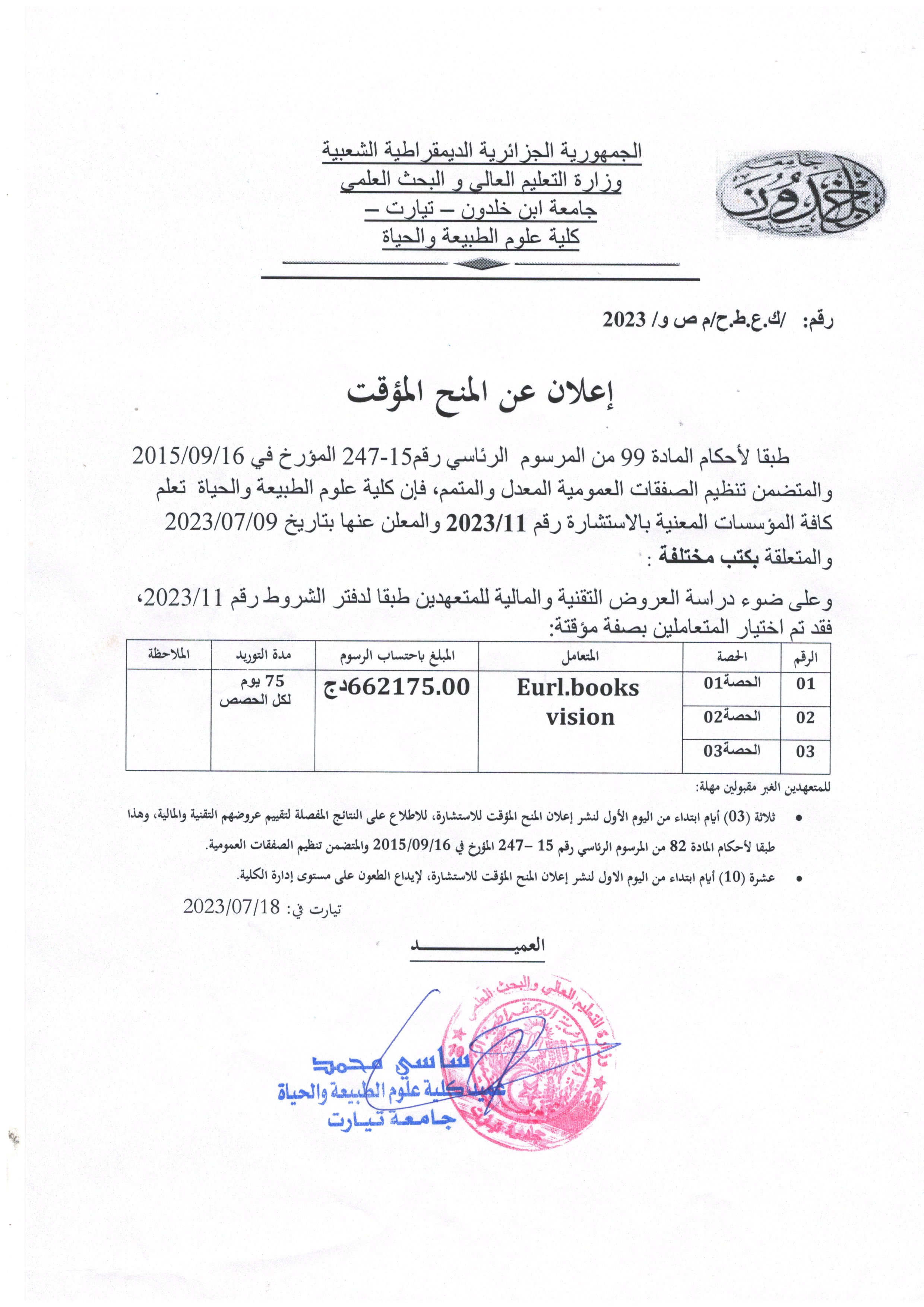 نشر في 18-07-2023من طرف حموسعيد كهينة المصلحة كلية علوم الطبيعة و الحياة