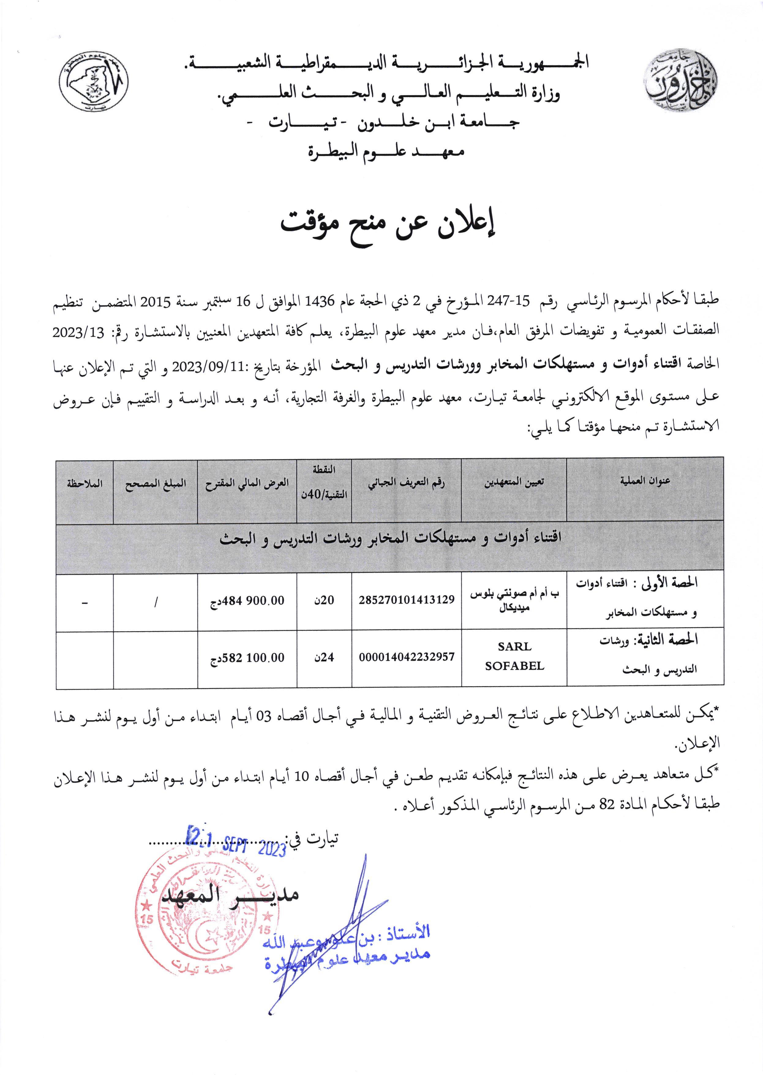 يعلن معهد علوم البيطرة عن قرار المنح المؤقت المتعلق بالاستشارة رقم 13/2023 المؤرخة يوم 11/09/2023 و الخاصة باقتناء أدوات و مستهلكات المخابر و ورشات التدريس و البحث لميزانية التسيير للسنة المالية 2023