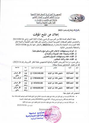 نشر في 16-10-2023من طرف حموسعيد كهينة المصلحة كلية علوم الطبيعة و الحياة إعلان عن المنح المؤقت للاستشارة رقم 2023/14
