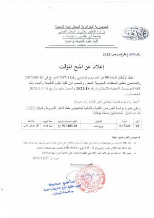 نشر في 23-11-2023من طرف حموسعيد كهينة المصلحة كلية علوم الطبيعة و الحياة إعلان عن المنح المؤقت للاستشارة رقم 2023/18