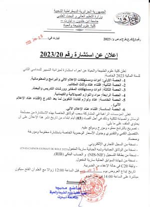 نشر في 26-11-2023من طرف حموسعيد كهينة المصلحة كلية علوم الطبيعة و الحياة إعلان عن استشارة رقم 2023/20