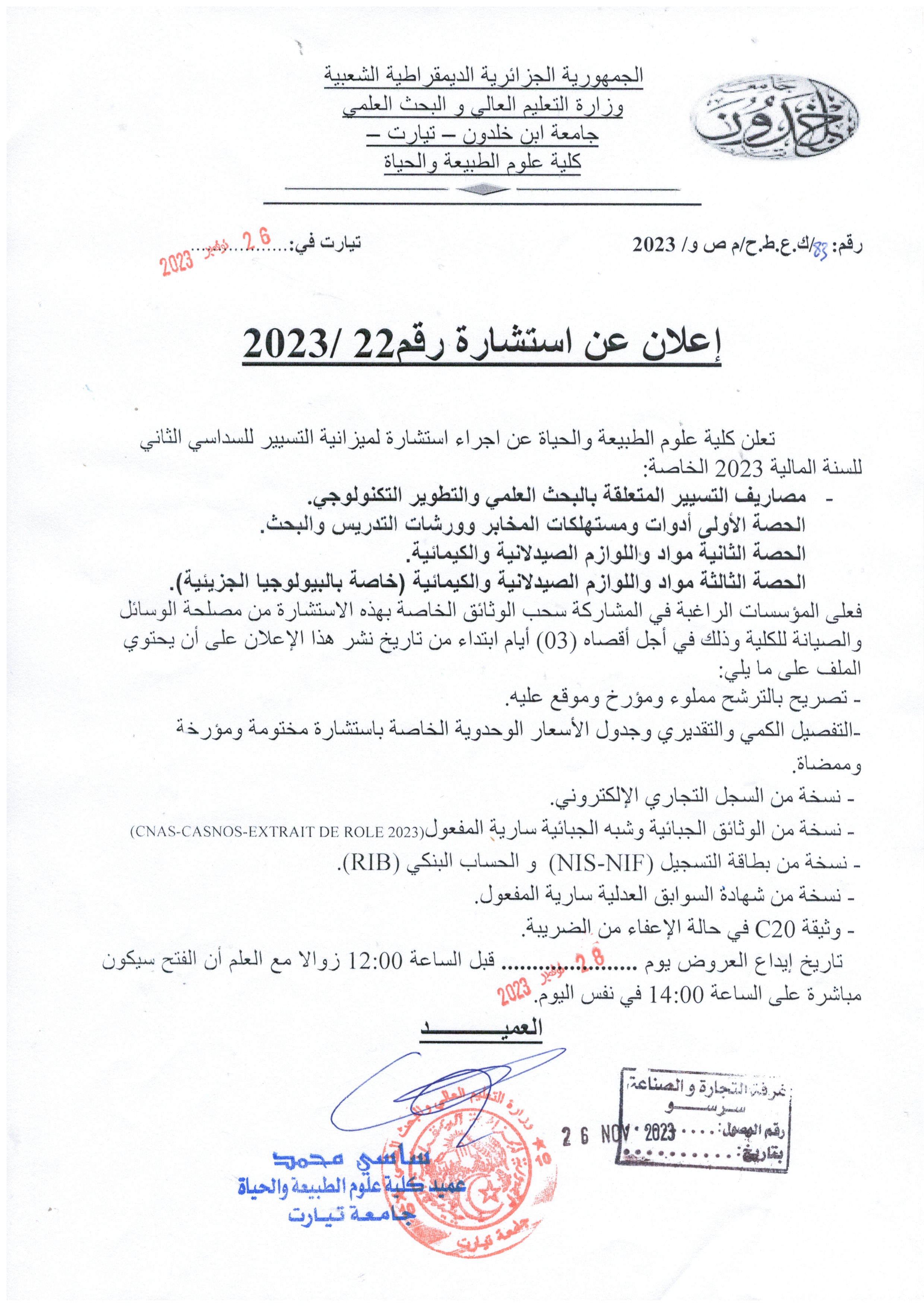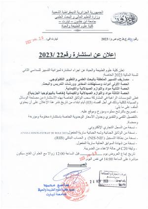 نشر في 26-11-2023من طرف حموسعيد كهينة المصلحة كلية علوم الطبيعة و الحياة إعلان عن استشارة رقم 2023/22
