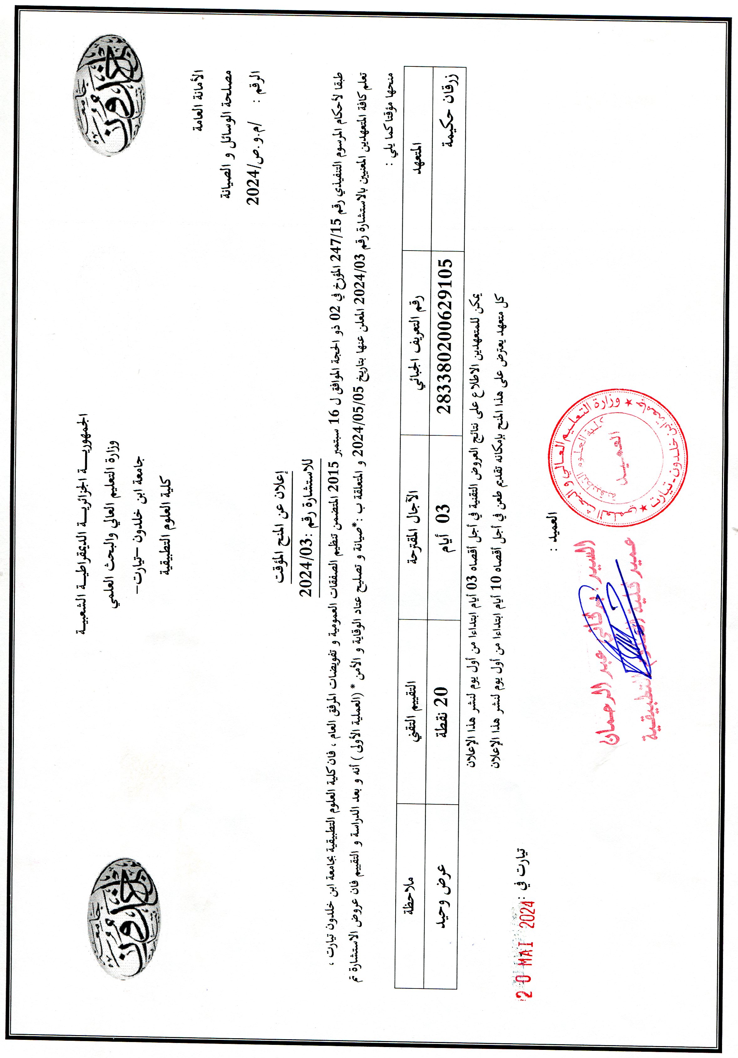 نشر في 12-06-2024من طرف العربي.ك المصلحة كلية العلوم التطبيقية إعلان عن قرار المنح المؤقت رقم 03/2024