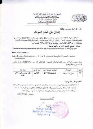 نشر في 29-09-2024من طرف حموسعيد كهينة المصلحة كلية علوم الطبيعة و الحياة إعلان عن المنح المؤقت للاستشارة رقم 2024/07
