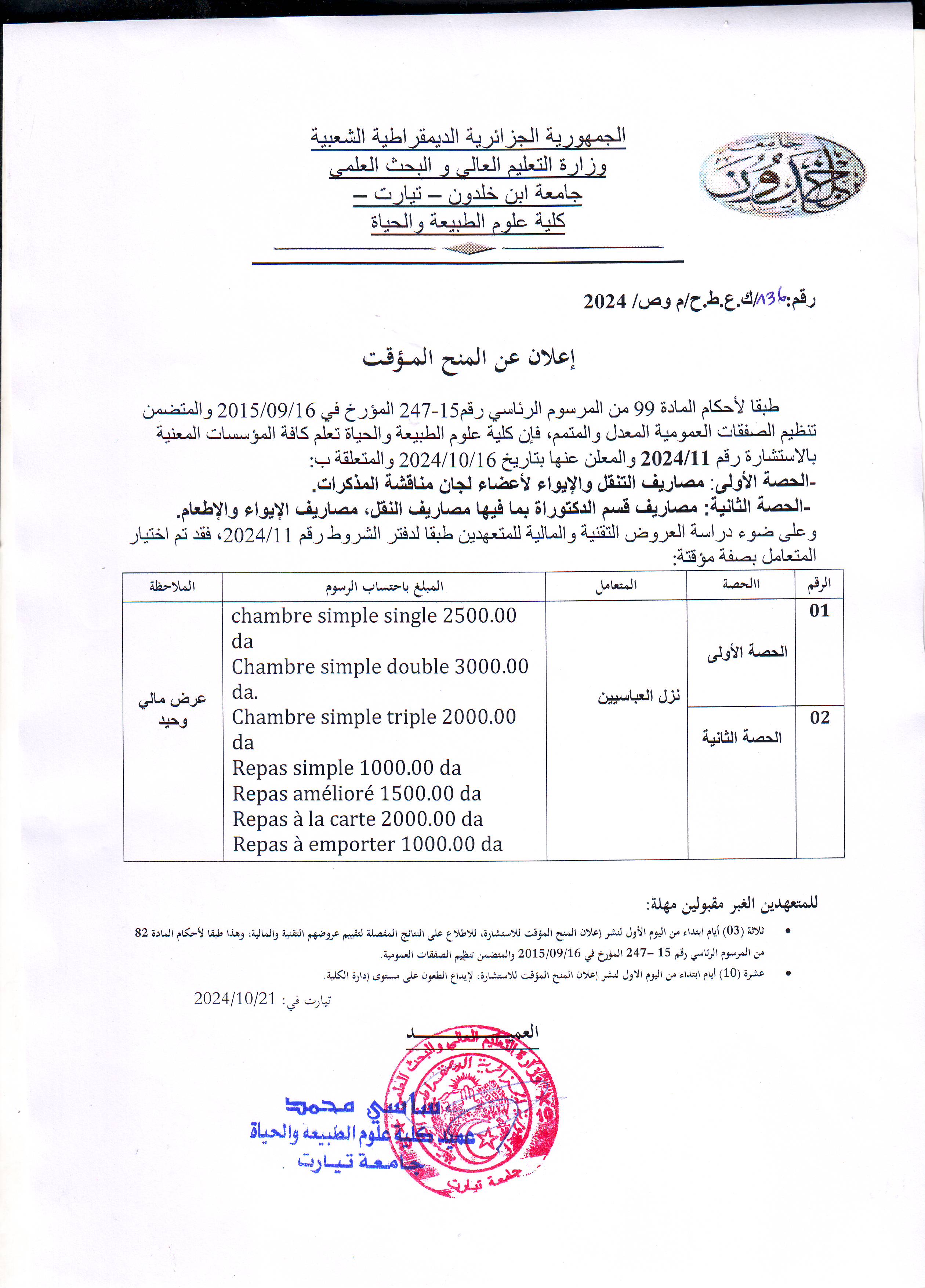 نشر في 22-10-2024من طرف حموسعيد كهينة المصلحة كلية علوم الطبيعة و الحياة إعلان عن المنح المؤقت للاستشارة رقم 2024/11