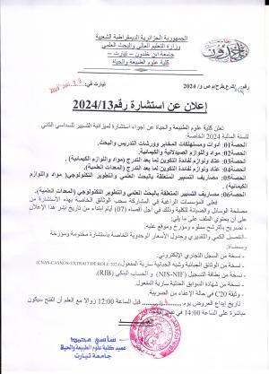 نشر في 29-10-2024من طرف حموسعيد كهينة المصلحة كلية علوم الطبيعة و الحياة إعلان عن استشارة رقم 2024/13
