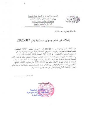 نشر في 10-09-2025من طرف حموسعيد كهينة المصلحة كلية علوم الطبيعة و الحياة إعلان عن عدم جدوى للاستشارة رقم 2025/07