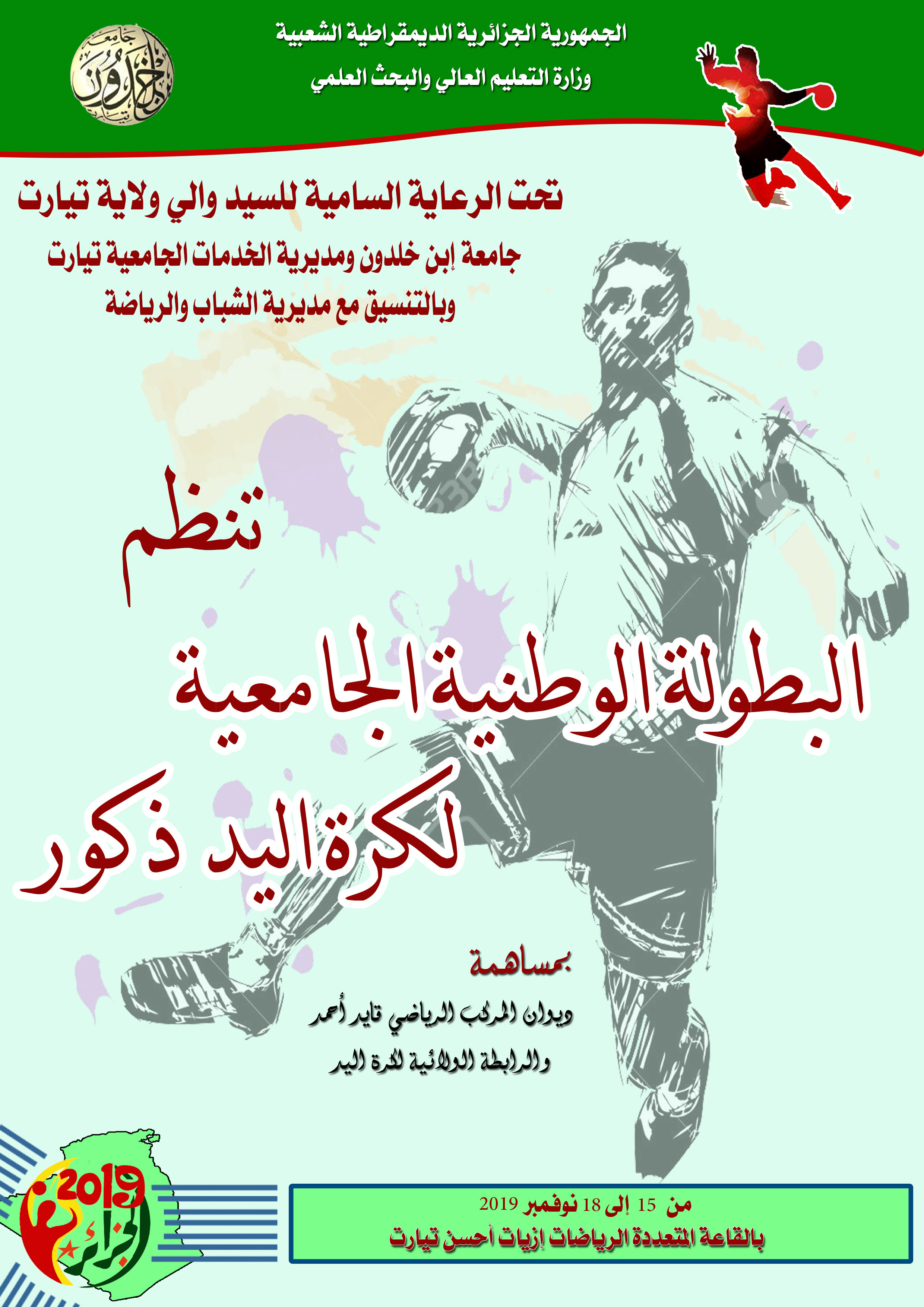 تحت الرعاية السامية للسيد والي ولاية تيارت, تنظم جامعة ابن خلدون بالتنسيق مع المديرية الولائية للخدمات الجامعية, البطولة الوطنية الجامعية لرياضة كرة اليد - ذكور