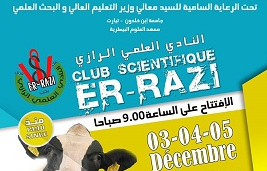 تحت الرعاية السامية لمعالي وزير التعليم العالي والبحث العلمي الاستاذ طاهر حجار ينظم معهد البيطرة بالتنسيق مع النادي العلمي الرازي بجامعة ابن خلدون تيارت, الملتقى الدولي الاول حول الطب البيطري تحت شعار: دور الطب البيطري في تنمية الاقتصاد والمحافظة على الصحة العامة والأمن الغذائي وذلك يومي 03,04 و05 ديسمبر 2018 بمعهد البيطرة بجامعة تيارت.